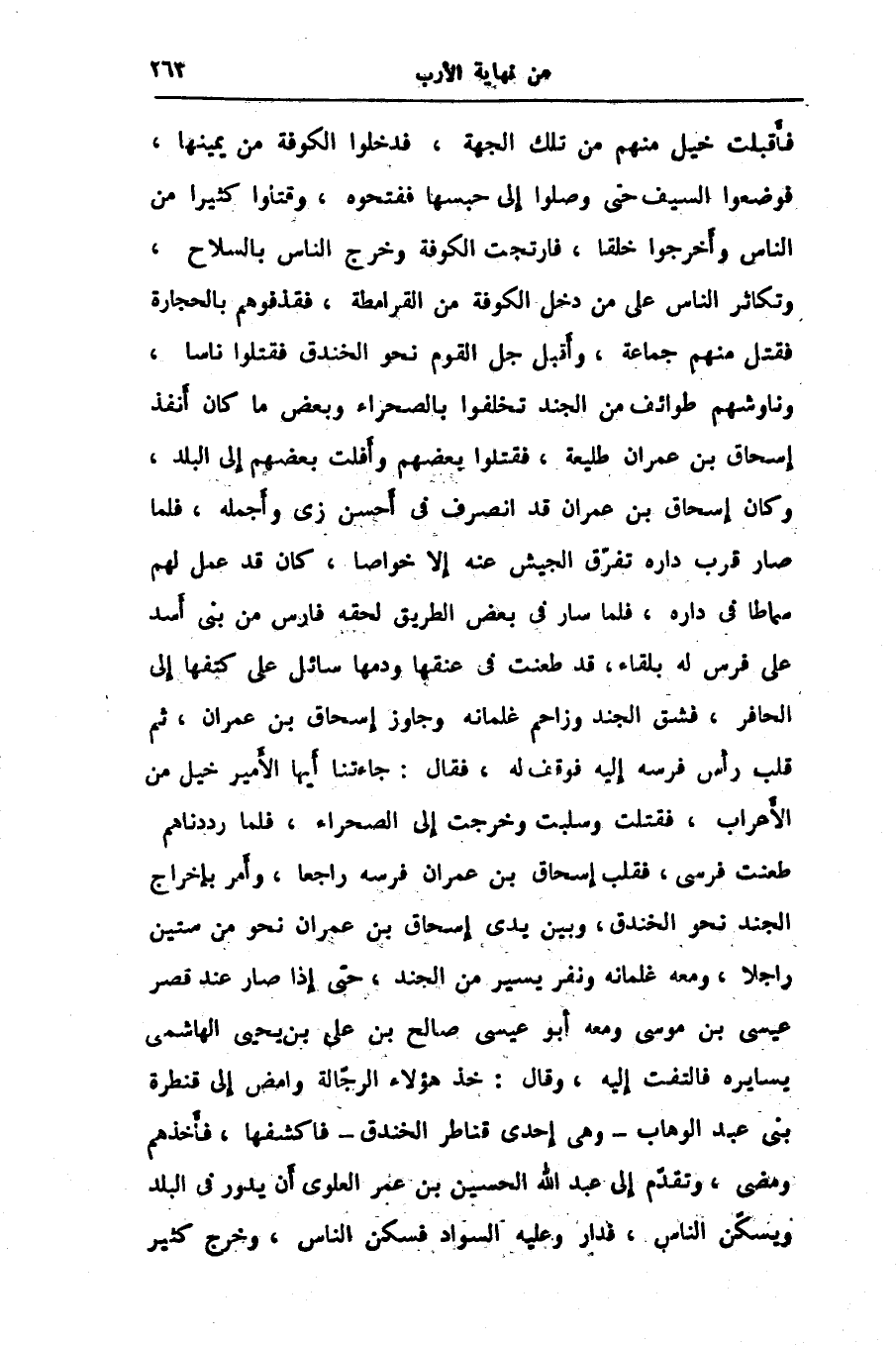 فأقبلت خيل منهم من تلك الجهة، فدخلوا الكوفة من يمينها، فوضعوا السيف حتى وصلوا إلى حبسها ففتحوه، وقتلوا كثيرا من الناس وأخرجوا خلقا، فارتجت الكوفة وخرج الناس بالسلاح، وتكاثر الناس على من دخل الكوفة من القرامطة، فقذفوهم بالحجارة فقتل منهم جماعة، وأقبل جل القوم نحو الخندق فقتلوا ناسا، وناوشهم طوائف من الجند تخلفوا بالصحراء وبعض ما كان أنفذ إسحاق بن عمران طليعة، فقتلوا بعضهم وأفلت بعضهم إلى البلد، وكان إسحاق بن عمران قد انصرف في أحسن زى وأجمله، فلما صار قرب داره تفرّق الجيش عنه إلا خواصا، كان قد عمل لهم سماطا في داره، فلما سار في بعض الطريق لحقه فارس من بنى أسد على فرس له بلقاء، قد طعنت في عنقها ودمها سائل على كتفها إلى الحافر، فشق الجند وزاحم غلمانه وجاوز إسحاق بن عمران، ثم قلب رأس فرسه إليه فوقف له، فقال: جاءتنا أيها الأمير خيل من الأعراب، فقتلت وسلبت وخرجت إلى الصحراء، فلما رددناهم طعنت فرسى، فقلب إسحاق بن عمران فرسه راجعا، وأمر بإخراج الجند نحو الخندق، وبين يدى إسحاق بن عمران نحو من ستين راجلا، ومعه غلمانه ونفر يسير من الجند، حتى إذا صار عند قصر عيسى بن موسى ومعه أبو عيسى صالح بن على بن يحيى الهاشمى يسايره فالتفت إليه، وقال: خذ هؤلاء الرجّالة وامض إلى قنطرة بنى عبد الوهاب- وهى إحدى قناطر الخندق- فاكشفها، فأخذهم ومضى، وتقدّم إلى عبد الله الحسين بن عمر العلوى أن يدور في البلد ويسكّن الناس، فدار وعليه السواد فسكن الناس، وخرج كثير