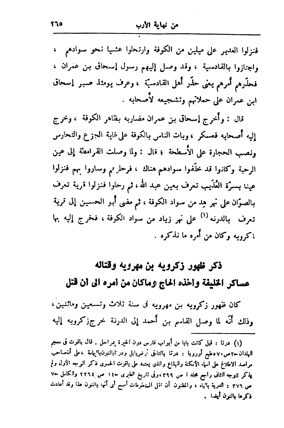 قال: وأخرج إسحاق بن عمران مضاربه بظاهر الكوفة، وخرج إليه أصحابه فعسكر، وبات الناس بالكوفة على غاية الجزع والتحارس ونصب الحجارة على الأسطحة؛ قال: ولما وصلت القرامطة إلى عين الرحبة وكانوا قد خلّفوا سوادهم هناك،؟؟؟ فرحلو ثم وساروا بهم فنزلوا عينا بسرّة العذيب تعرف بعين عبد الله، ثم رحلوا فنزلوا قرية تعرف بالصوّان على نهر هد من سواد الكوفة، ثم مضى أبو الحسين إلى قرية تعرف بالدرنه «1» على نهر زياد من سواد الكوفة، فخرج إليه بها زكرويه وكان من أمره ما نذكره.