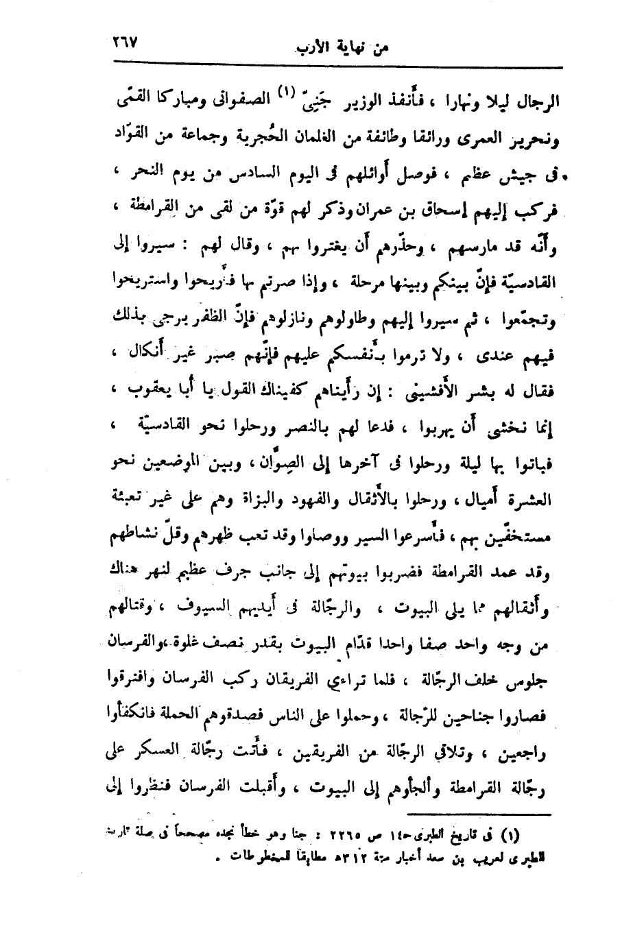 الرجال ليلا ونهارا، فأنفذ الوزير جنىّ «1» الصفوانى ومباركا القمّى ونحرير العمرى ورائقا وطائفة من الغلمان الحجرية وجماعة من القوّاد فى جيش عظم، فوصل أوائلهم في اليوم السادس من يوم النحر، فركب إليهم إسحاق بن عمران وذكر لهم قوّة من لقى من القرامطة، وأنّه قد مارسهم، وحذّرهم أن يغتروا بهم، وقال لهم: سيروا إلى القادسيّة فإنّ بينكم وبينها مرحلة، وإذا صرتم بها فأريحوا واستريحوا وتجمّعوا، ثم سيروا إليهم وطاولوهم ونازلوهم فإنّ الظفر برجى بذلك فيهم عندى، ولا ترموا بأنفسكم عليهم فإنّهم صبر غير أنكال، فقال له بشر الأفشينى: إن رأيناهم كفيناك القول يا أبا يعقوب، إنما نخشى أن يهربوا، فدعا لهم بالنصر ورحلوا نحو القادسيّة، فباتوا بها ليلة ورحلوا في آخرها إلى الصوّان، وبين الموضعين نحو العشرة أميال، ورحلوا بالأثقال والفهود والبزاة وهم على غير تعبئة مستخفّين بهم، فأسرعوا السير ووصلوا وقد تعب ظهرهم وقلّ نشاطهم وقد عمد القرامطة فضربوا بيوتهم إلى جانب جرف عظيم لنهر هناك وأثقالهم مما يلى البيوت، والرجّالة في أيديهم السيوف، وقتالهم من وجه واحد صفا واحدا قدّام البيوت بقدر نصف غلوة، والفرسان جلوس خلف الرجّالة، فلما تراءى الفريقان ركب الفرسان وافترقوا فصاروا جناحين للرّجالة، وحملوا على الناس فصدقوهم الحملة فانكفأوا راجعين، وتلاقى الرجّالة من الفريقين، فأتت رجّالة العسكر على رجّالة القرامطة وألجأوهم إلى البيوت، وأقبلت الفرسان فنظروا إلى