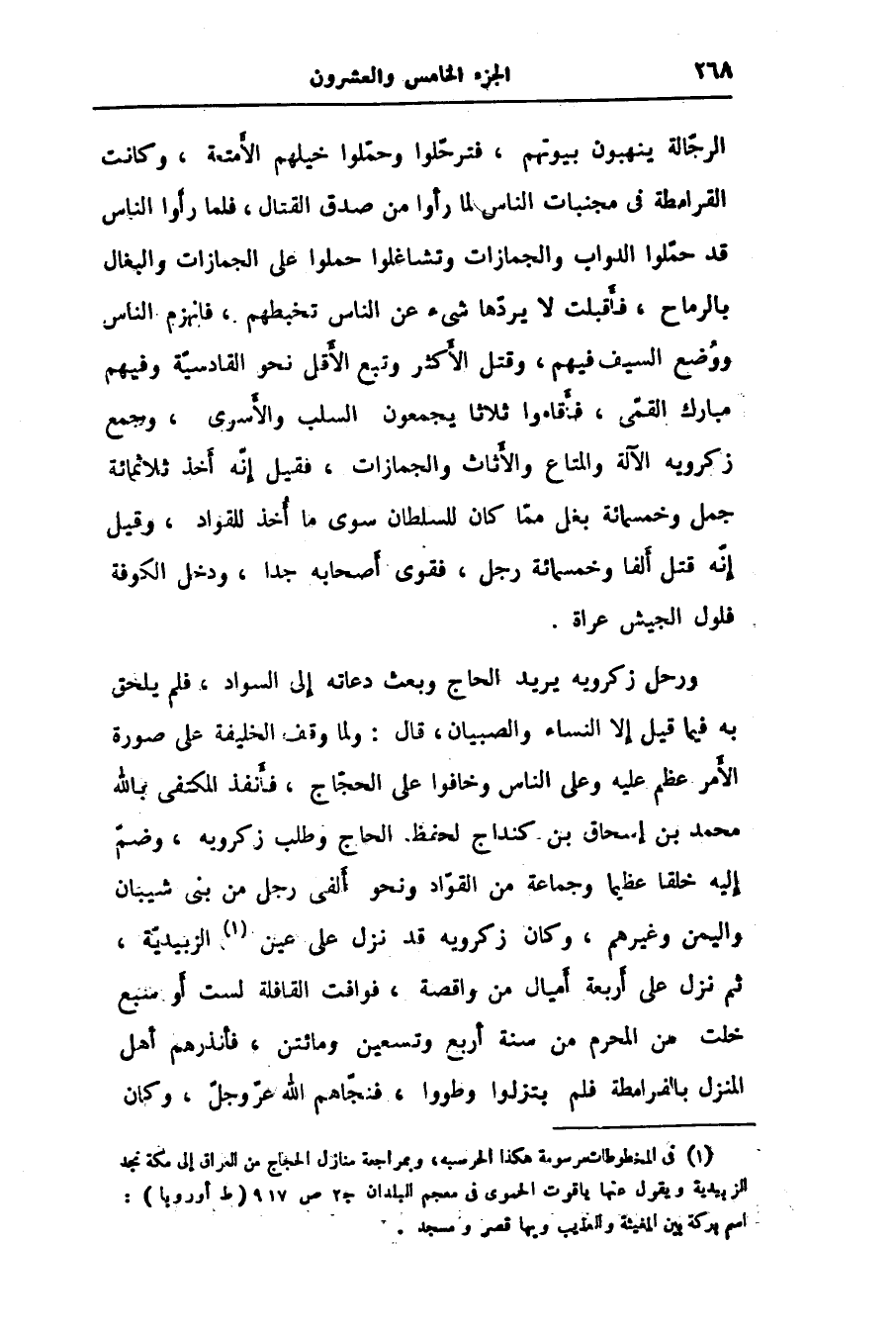الرجّالة ينهبون بيوتهم، فترحّلوا وحمّلوا خيلهم الأمتعة، وكانت القرامطة في مجنبات الناس لما رأوا من صدق القتال، فلما رأوا الناس قد حمّلوا الدواب والجمازات وتشاغلوا حملوا على الجمازات والبغال بالرماح، فأقبلت لا يردّها شىء عن الناس تخبطهم، فانهزم الناس ووضع السيف فيهم، وقتل الأكثر وتبع الأقل نحو القادسيّة وفيهم مبارك القمّى، فأقاموا ثلاثا يجمعون السلب والأسرى، وجمع زكرويه الآلة والمتاع والأثاث والجمازات، فقيل إنّه أخذ ثلاثمائة جمل وخمسمائة بغل ممّا كان للسلطان سوى ما أخذ للقواد، وقيل إنّه قتل ألفا وخمسمائة رجل، فقوى أصحابه جدا، ودخل الكوفة فلول الجيش عراة.