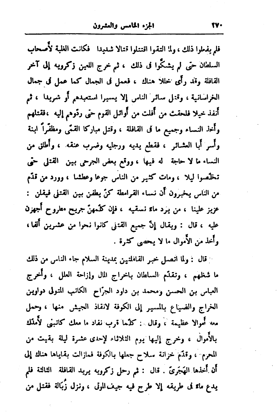 فلم يفعلوا ذلك، ولما التقوا اقتتلوا قتالا شديدا فكانت الغلبة لأصحاب السلطان حتى لم يشكّوا في ذلك، ثم خرج اللعين زكرويه إلى آخر القافلة وقد رأى خللا هناك، فعمل في الجمال كما عمل في جمال الخراسانية، وقتل سائر الناس إلا يسيرا استعبدهم أو شريدا، ثم أنفذ خيلا فلحقت من أفلت من أوائل القوم حتى ردّوهم إليه، فقتلهم وأخذ النساء وجميع ما في القافلة، وقتل مباركا القمّى ومظفّرا ابنة وأسر أبا العشائر، فقطع يديه ورجليه وضرب عنقه، وأطلق من النساء ما لا حاجة له فيها، ووقع بعض الجرحى بين القتلى حتى تخلّصوا ليلا، ومات كثير من الناس جوعا وعطشا، وورد من قدّم من الناس يخبرون أن نساء القرامطة كنّ يطفن بين القتلى فيقلن: