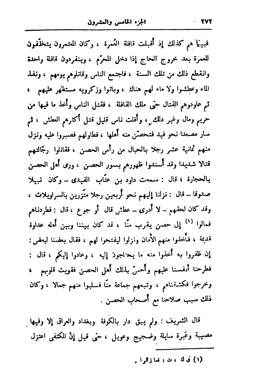 فبينما هم كذلك إذ أقبلت قافلة العمرة، وكان المعتمرون يتخلّفون للعمرة بعد خروج الحاج إذا دخل المحرّم، وينفردون قافلة واحدة وانقطع ذلك من تلك السنة، فاجتمع الناس وقاتلوهم يومهم، ونفذ الماء وعطشوا ولا ماء لهم هناك، وباتوا وزكرويه مستظهر عليهم، ثم عاودوهم القتال حتى ملك القافلة، فقتل الناس وأخذ ما فيها من حريم ومال وغير ذلك، وأفلت ناس قليل قتل أكثرهم العطش، ثم سار مصعدا نحو فيد فتحصّن منه أهلها، فطاولهم فصبروا عليه ونزل منهم ثمانية عشر رجلا بالحبال من رأس الحصن، فقاتلوا رجّالتهم قتالا شديدا وقد أسندوا ظهورهم بسور الحصن، ورمى أهل الحصن بالحجارة؛ قال: سمعت داود بن عتاب الفيدى- وكان نبيلا صدوقا- قال: نزلنا إليهم نحو أربعين رجلا متزرين بالسراويلات، وقد كان لحقهم- لا أدرى- عطش قال أو جوع، قال: فطردناهم فمالوا «1» إلى حصن يقرب منّا، قد كان بيننا وبين أهله عداوة قديمة، فأخذوا منهم الأمان ونزلوا ليفتحوا لهم، فقال بعضنا لبعض:
