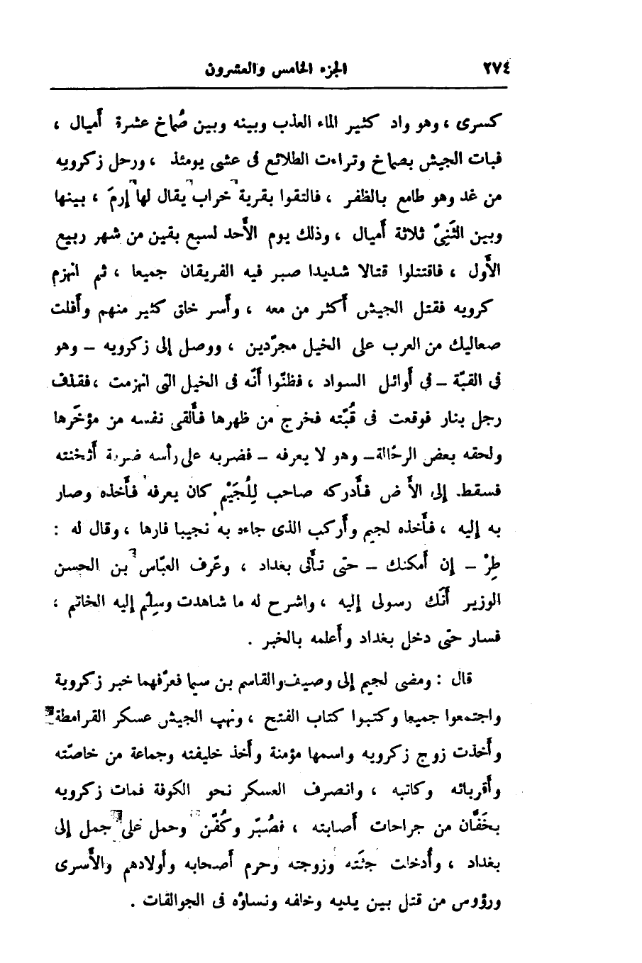 كسرى، وهو واد كثير الماء العذب وبينه وبين صماخ عشرة أميال، فبات الجيش بصماخ وتراءت الطلائع في عشى يومئذ، ورحل زكرويه من غد وهو طامع بالظفر، فالتقوا بقرية خراب يقال لها إرم، بينها وبين الثنىّ ثلاثة أميال، وذلك يوم الأحد لسبع بقين من شهر ربيع الأول، فاقتتلوا قتالا شديدا صبر فيه الفريقان جميعا، ثم انهزم كرويه فقتل الجيش أكثر من معه، وأسر خلق كثير منهم وأفلت صعاليك من العرب على الخيل مجرّدين، ووصل إلى زكرويه- وهو في القبّة- فى أوائل السواد، فظنّوا أنّه في الخيل التى انهزمت، فقذف رجل بنار فوقعت في قبّته فخرج من ظهرها فألقى نفسه من مؤخّرها ولحقه بعض الرحّالة- وهو لا يعرفه- فضربه على رأسه ضربة أثخنته فسقط إلى الأرض فأدركه صاحب للجيم كان يعرفه فأخذه وصار به إليه، فأخذه لجيم وأركب الذى جاءه به نجيبا فارها، وقال له: