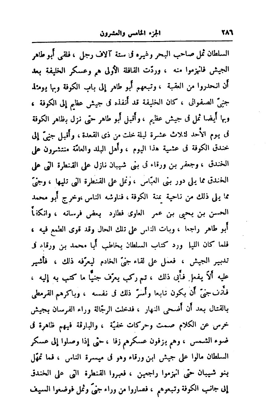 السلطان ثمل صاحب البحر وغيره في ستة آلاف رجل، فلقى أبو طاهر الجيش فانهزموا منه، وردّت القافلة الأولى هم وعسكر الخليفة بعد أن انحدروا من العقبة، وتبعهم أبو طاهر إلى باب الكوفة وبها يومئذ جنىّ الصفوانى، كان الخليفة قد أنفذه في جيش عظيم إلى الكوفة، وبها أيضا ثمل في جيش عظيم، وأقبل أبو طاهر حتى نزل بظاهر الكوفة في يوم الأحد لثلاث عشرة ليلة خلت من ذى القعدة، وأقبل جنىّ إلى خندق الكوفة في عشية هذا اليوم، وأهل البلد والعامّة منتشرون على الخندق، وجعفر بن ورقاء في بنى شيبان نازل على القنطرة التى على الخندق مما يلى دور بنى العبّاس، ونمل على القنطرة التى تليها، وجنىّ مما يلى ذلك من ناحية يمنة الكوفة، فناوشه الناس، وخرج أبو محمد الحسن بن يحيى بن عمر العلوى فطارد بعض فرسانه، وانكفأ أبو طاهر راجعا، وبات الناس على تلك الحال وقد قوى الطمع فيه، فلما كان الليل ورد كتاب السلطان يخاطب أبا محمد بن ورقاء في تدبير الجيش، فعمل على لقاء جنىّ الخادم ليعرّفه ذلك، فأشير عليه ألا يفعل فأبى ذلك، تم ركب يعرّف جنيّا ما كتب به إليه، فأنف جنىّ أن يكون تابعا وأسرّ ذلك في نفسه، وباكرهم القرمطى بالقتال بعد أن أضحى النهار، فدخلت الرجّالة وراء الفرسان بجيش خرس عن الكلام صمت وحركات خفيّة، والبارقة فيهم ظاهرة في ضوء الشمس، وهم يزفون عسكرهم زفا، حتى إذا وصلوا إلى عسكر السلطان مالوا على جيش ابن ورقاء وهو في ميسرة الناس، فما تمهّل بنو شيبان حتى انهزموا راجعين، فعبروا القنطرة التى على الخندق إلى جانب الكوفة وتبعوهم، فصاروا من وراء جنىّ وثمل فوضعوا السيف