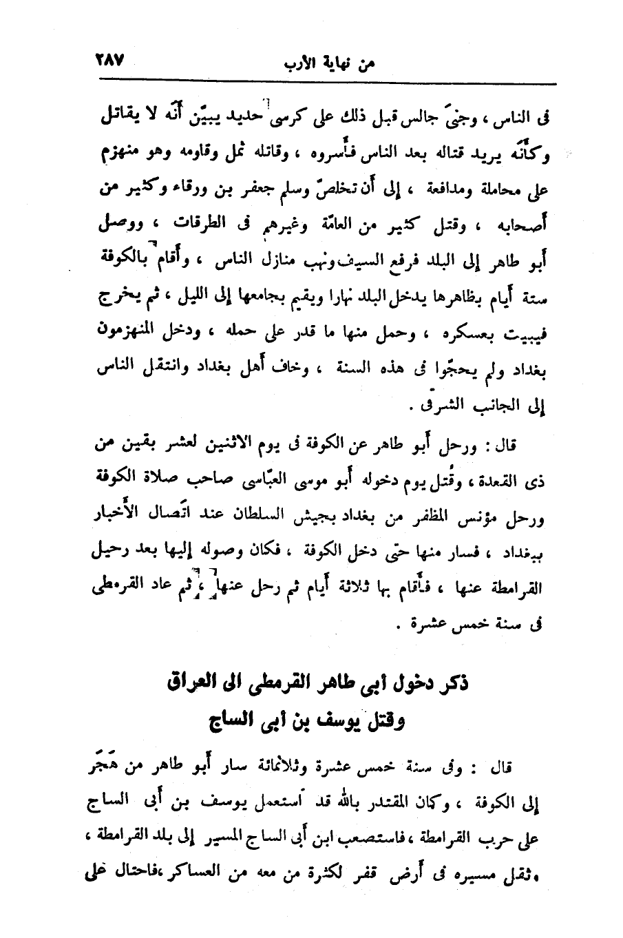 في الناس، وجنى جالس قبل ذلك على كرسى حديد يبيّن أنّه لا يقاتل وكأنّه يريد قتاله بعد الناس فأسروه، وقاتله ثمل وقاومه وهو منهزم على محاملة ومدافعة، إلى أن تخلصّ وسلم جعفر بن ورقاء وكثير من أصحابه، وقتل كثير من العامّة وغيرهم في الطرقات، ووصل أبو طاهر إلى البلد فرفع السيف ونهب منازل الناس، وأقام بالكوفة ستة أيام بظاهرها يدخل البلد نهارا ويقيم بجامعها إلى الليل، ثم يخرج فيبيت بعسكره، وحمل منها ما قدر على حمله، ودخل المنهزمون بغداد ولم يحجّوا في هذه السنة، وخاف أهل بغداد وانتقل الناس إلى الجانب الشرقى.