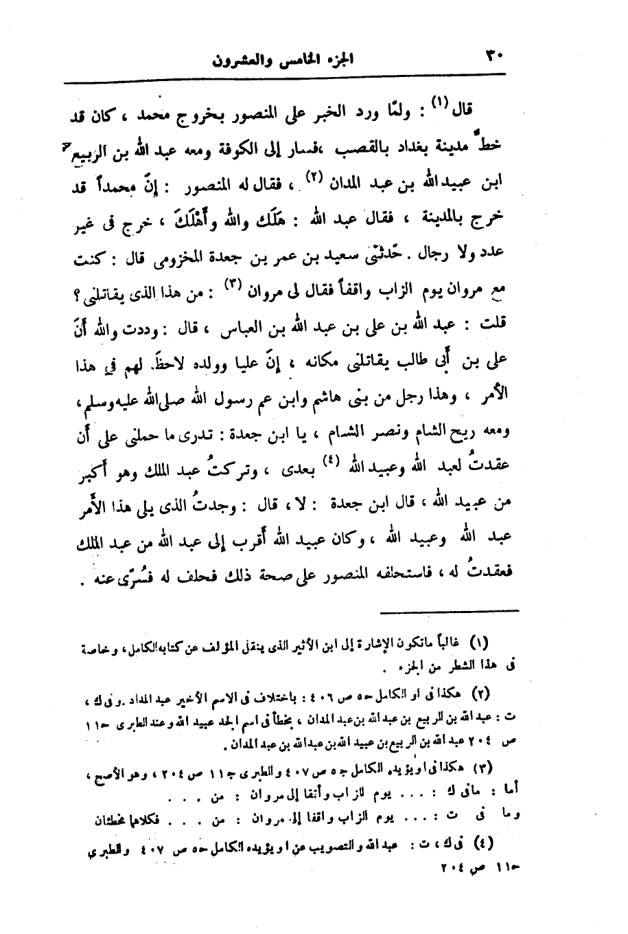 قال «1» : ولمّا ورد الخبر على المنصور بخروج محمد، كان قد خطّ مدينة بغداد بالقصب، فسار إلى الكوفة ومعه عبد الله بن الربيع ابن عبيد الله بن عبد المدان «2» ، فقال له المنصور: إنّ محمدا قد خرج بالمدينة، فقال عبد الله: هلك والله وأهلك، خرج في غير عدد ولا رجال. حدّثنى سعيد بن عمر بن جعدة المخزومى قال: كنت مع مروان يوم الزاب واقفا فقال لى مروان «3» : من هذا الذى يقاتلنى؟