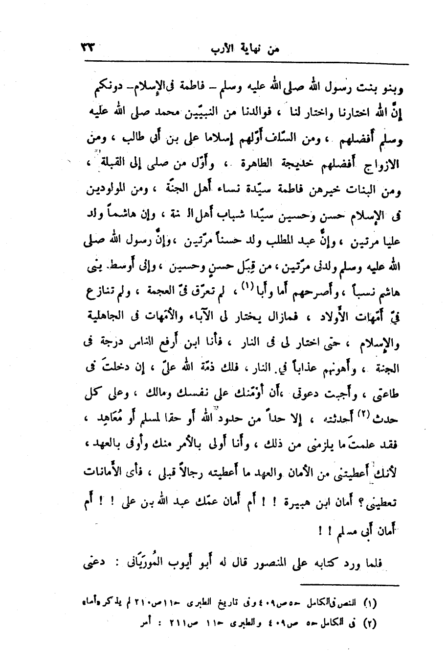 وبنو بنت رسول الله صلى الله عليه وسلم- فاطمة في الإسلام- دونكم إنّ الله اختارنا واختار لنا، فوالدنا من النبيّين محمد صلى الله عليه وسلم أفضلهم، ومن السّلف أوّلهم إسلاما على بن أبى طالب، ومن الازواج أفضلهم خديجة الطاهرة، وأوّل من صلى إلى القبلة، ومن البنات خيرهن فاطمة سيّدة نساء أهل الجنّة، ومن المولودين فى الإسلام حسن وحسين سيّدا شباب أهل الجنة، وإن هاشما ولد عليا مرتين، وإنّ عبد المطلب ولد حسنا مرّتين، وإنّ رسول الله صلى الله عليه وسلم ولدنى مرّتين، من قبل حسن وحسين، وإنى أوسط بنى هاشم نسبا، وأصرحهم أما وأبا «1» ، لم تعرّق فيّ العجمة، ولم تنازع فيّ أمّهات الأولاد، فما زال يختار لى الآباء والأمّهات في الجاهلية والإسلام، حتى اختار لى في النار، فأنا ابن أرفع الناس درجة في الجنة، وأهونهم عذابا في النار، فلك ذمّة الله علىّ، إن دخلت في طاعتى، وأجبت دعوتى، أن أؤمّنك على نفسك ومالك، وعلى كل حدث «2» أحدثته، إلا حدا من حدود الله أو حقا لمسلم أو معاهد، فقد علمت ما يلزمنى من ذلك، وأنا أولى بالأمر منك وأوفى بالعهد، لأنك أعطيتنى من الأمان والعهد ما أعطيته رجالا قبلى، فأى الأمانات تعطينى؟ أمان ابن هبيرة!! أم أمان عمّك عبد الله بن على!! أم أمان أبى مسلم!! فلما ورد كتابه على المنصور قال له أبو أيوب الموريانى: دعنى