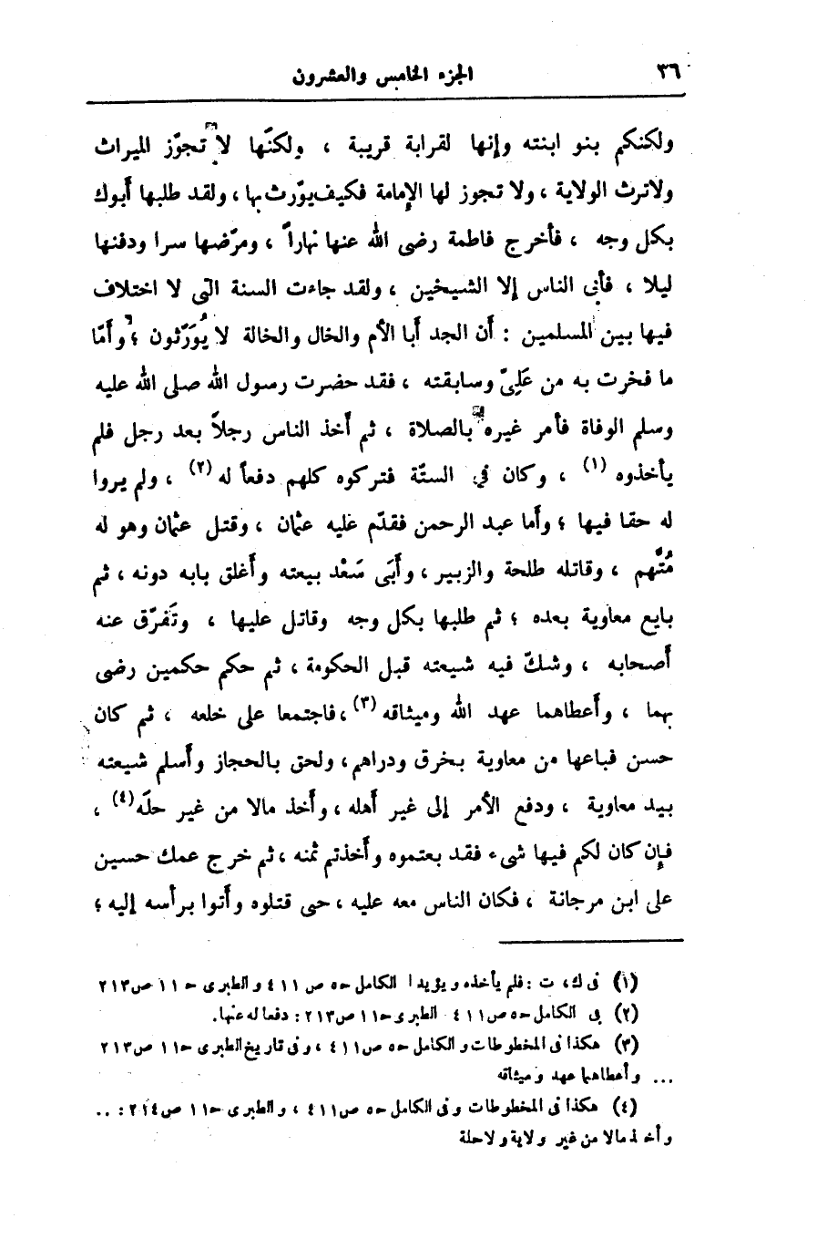 ولكنكم بنو ابنته وإنها لقرابة قريبة، ولكنّها لا تجوّز الميراث ولا ترث الولاية، ولا تجوز لها الإمامة فكيف يورّث بها، ولقد طلبها أبوك بكل وجه، فأخرج فاطمة رضى الله عنها نهارا، ومرّضها سرا ودفنها ليلا، فأبى الناس إلا الشيخين، ولقد جاءت السنة التى لا اختلاف فيها بين المسلمين: أن الجد أبا الأم والخال والخالة لا يورّثون؛ وأمّا ما فخرت به من علىّ وسابقته، فقد حضرت رسول الله صلى الله عليه وسلم الوفاة فأمر غيره بالصلاة، ثم أخذ الناس رجلا بعد رجل فلم يأخذوه «1» ، وكان في الستّة فتركوه كلهم دفعا له «2» ، ولم يروا له حقا فيها؛ وأما عبد الرحمن فقدّم عليه عثمان، وقتل عثمان وهو له متّهم، وقاتله طلحة والزبير، وأبى سعد بيعته وأغلق بابه دونه، ثم بايع معاوية بعده؛ ثم طلبها بكل وجه وقاتل عليها، وتفرّق عنه أصحابه، وشكّ فيه شيعته قبل الحكومة، ثم حكم حكمين رضى بهما، وأعطاهما عهد الله وميثاقه «3» ، فاجتمعا على خلعه، ثم كان حسن فباعها من معاوية بخرق ودراهم، ولحق بالحجاز وأسلم شيعته بيد معاوية، ودفع الأمر إلى غير أهله، وأخذ مالا من غير حله «4» ، فإن كان لكم فيها شىء فقد بعتموه وأخذتم ثمنه، ثم خرج عمك حسين على ابن مرجانة، فكان الناس معه عليه، حتى قتلوه وأتوا برأسه إليه؛