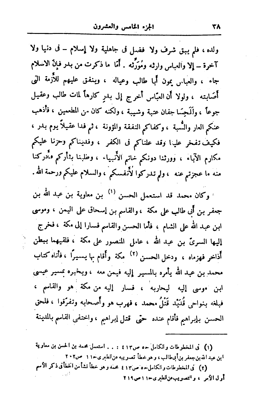 ولده، فلم يبق شرف ولا فضل في جاهلية ولا إسلام- فى دنيا ولا آخرة- إلا والعباس وارثه ومورّثه. أمّا ما ذكرت من بدر فإنّ الاسلام جاء، والعباس يمون أبا طالب وعياله، وينفق عليهم للأزمة التى أصابته، ولولا أن العبّاس أخرج إلى بدر كارها لمات طالب وعقيل جوعا، وللحسا جفان عتبة وشيبة، ولكنه كان من المطعمين، فأذهب عنكم العار والسّبة، وكفاكم النفقة والمؤونة، ثم فدا عقيلا يوم بدر، فكيف تفخر علينا وقد علناكم في الكفر، وفديناكم وحزنا عليكم مكارم الآباء، وورثنا دونكم خاتم الأنبياء، وطلبنا بثأركم فأدركنا منه ما عجزتم عنه، ولم تدركوا لأنفسكم، والسلام عليكم ورحمة الله.