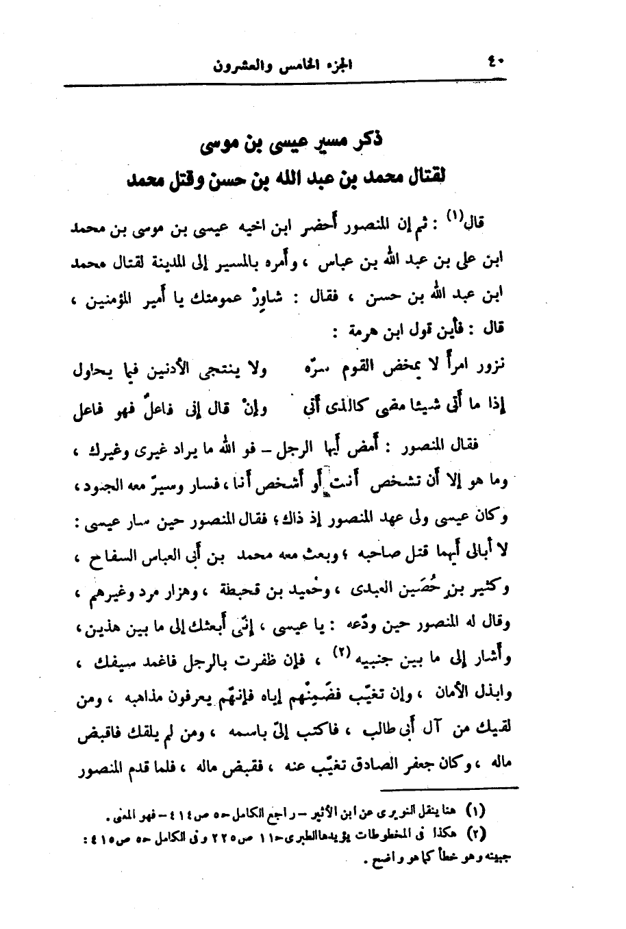 لا أبالى أيهما قتل صاحبه؛ وبعث معه محمد بن أبى العباس السفاح، وكثير بن حصين العبدى، وحميد بن قحبطة، وهزار مرد وغيرهم، وقال له المنصور حين ودّعه: يا عيسى، إنّى أبعثك إلى ما بين هذين، وأشار إلى ما بين جنبيه «2» ، فإن ظفرت بالرجل فاغمد سيفك، وابذل الأمان، وإن تغيّب فضمنهم إياه فإنّهم يعرفون مذاهبه، ومن لقيك من آل أبى طالب، فاكتب إلىّ باسمه، ومن لم يلقك فاقبض ماله، وكان جعفر الصادق تغيّب عنه، فقبض ماله، فلما قدم المنصور