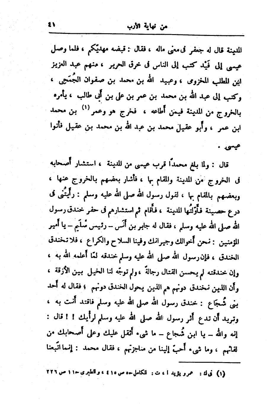 قال: ولما بلغ محمدا قرب عيسى من المدينة، استشار أصحابه فى الخروج من المدينة والمقام بها، فأشار بعضهم بالخروج عنها، وبعضهم بالمقام بها، لقول رسول الله صلى الله عليه وسلم: رأيتنى في درع حصينة فأوّلتها المدينة، فأقام ثم استشارهم في حفر خندق رسول الله صلى الله عليه وسلم، فقال له جابر بن أنس- رئيس سليم- يا أمير المؤمنين: نحن أخوالك وجيرانك وفينا السلاح والكراع، فلا تخندق الخندق، فإن رسول الله صلى الله عليه وسلم خندقه لمّا أعلمه الله به، وإن خندقته لم يحسن القتال رجالة، ولم توجّه لنا الخيل بين الأزقة، وأن الذين نخندق دونهم هم الذين يحول الخندق دونهم؛ فقال له أحد بنى شجاع: خندق رسول الله صلى الله عليه وسلم فاقتد أنت به، وتريد أن تدع أثر رسول الله صلى الله عليه وسلم لرأيك!! قال: