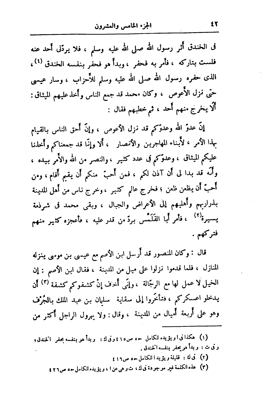 فى الخندق أثر رسول الله صلى الله عليه وسلم، فلا يردّنى أحد عنه فلست بتاركه، فأمر به فحفر، وبدأ هو فحفر بنفسه الخندق «1» ، الذى حفره رسول الله صلى الله عليه وسلم للأحزاب، وسار عيسى حتى نزل الأعوص، وكان محمد قد جمع الناس وأخذ عليهم الميثاق: