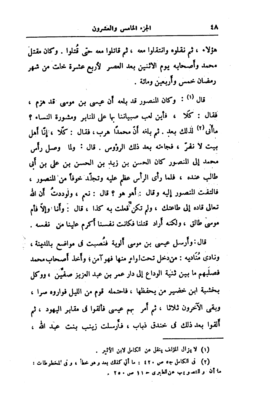 قال «1» : وكان المنصور قد بلعه أن عيسى بن موسى قد هزم، فقال: كلا، فأين لعب صبياننا بها على المنابر ومشورة النساء؟