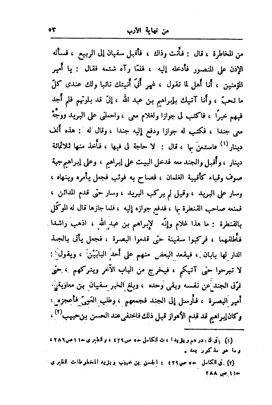 من المخاطرة، قال: فأنت وذاك، فأقبل سفيان إلى الربيع، فسأله الإذن على المنصور فأدخله إليه، فلمّا رآه شتمه فقال: يا أمير المؤمنين، أنا أهل لما تقول، غير أنى أتيتك تائبا ولك عندى كلّ ما تحبّ، وأنا آتيك بإبراهيم بن عبد الله، إنّى قد بلوتهم فلم أجد فيهم خيرا، فاكتب لى جوازا ولغلام معى، واحملنى على البريد ووجّه معى جندا، فكتب له جوازا ودفع إليه جندا، وقال له: هذه ألف دينار «1» فاستعن بها، قال: لا حاجة لى فيها، فأخذ منها ثلاثمائة دينار، وأقبل والجند معه فدخل البيت على إبراهيم، وعلى إبراهيم جبة صوف وقباء كأقبية الغلمان، فصاح به فوثب فجعل يأمره وينهاه، وسار على البريد، وقيل لم يركب البريد، وسار حتى قدم المدائن، فمنعه صاحب القنطرة بها، فدفع جوازه إليه، فلما جازها قال له الموكّل بالقنطرة: ما هذا غلام وإنّه لإبراهيم بن عبد الله، اذهب راشدا فأطلقهما، فركبوا سفينة حتى قدموا البصرة، فجعل يأتى بالجند الدار لها بابان، فيقعد البعض منهم على أحد البابين، ويقول: