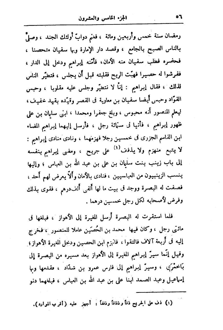 رمضان سنة خمس وأربعين ومائة، فغنم دوابّ أولئك الجند، وصلّى بالناس الصبح بالجامع، وقصد دار الإمارة وبها سفيان متحصنا، فحضره فطلب سفيان منه الأمان، فأمّنه إبراهيم ودخل إلى الدار، ففرشوا له حصيرا فهبّت الريح فقلبته قبل أن يجلس، فتطيّر الناس لذلك، فقال إبراهيم: إنا لا نتطيّر وجلس عليه مقلوبا، وحبس القوّاد وحبس أيضا سفيان بن معاوية في القصر وقيّده بقيد خفيف، ليعلم المنصور أنه محبوس، وبلغ جعفرا ومحمدا، ابنى سليمان بن على ظهور إبراهيم، فأتيا في ستمائة رجل، فأرسل إليهما إبراهيم المضاء ابن القاسم الجزرى في خمسين رجلا فهزمهما، ونادى منادى إبراهيم: