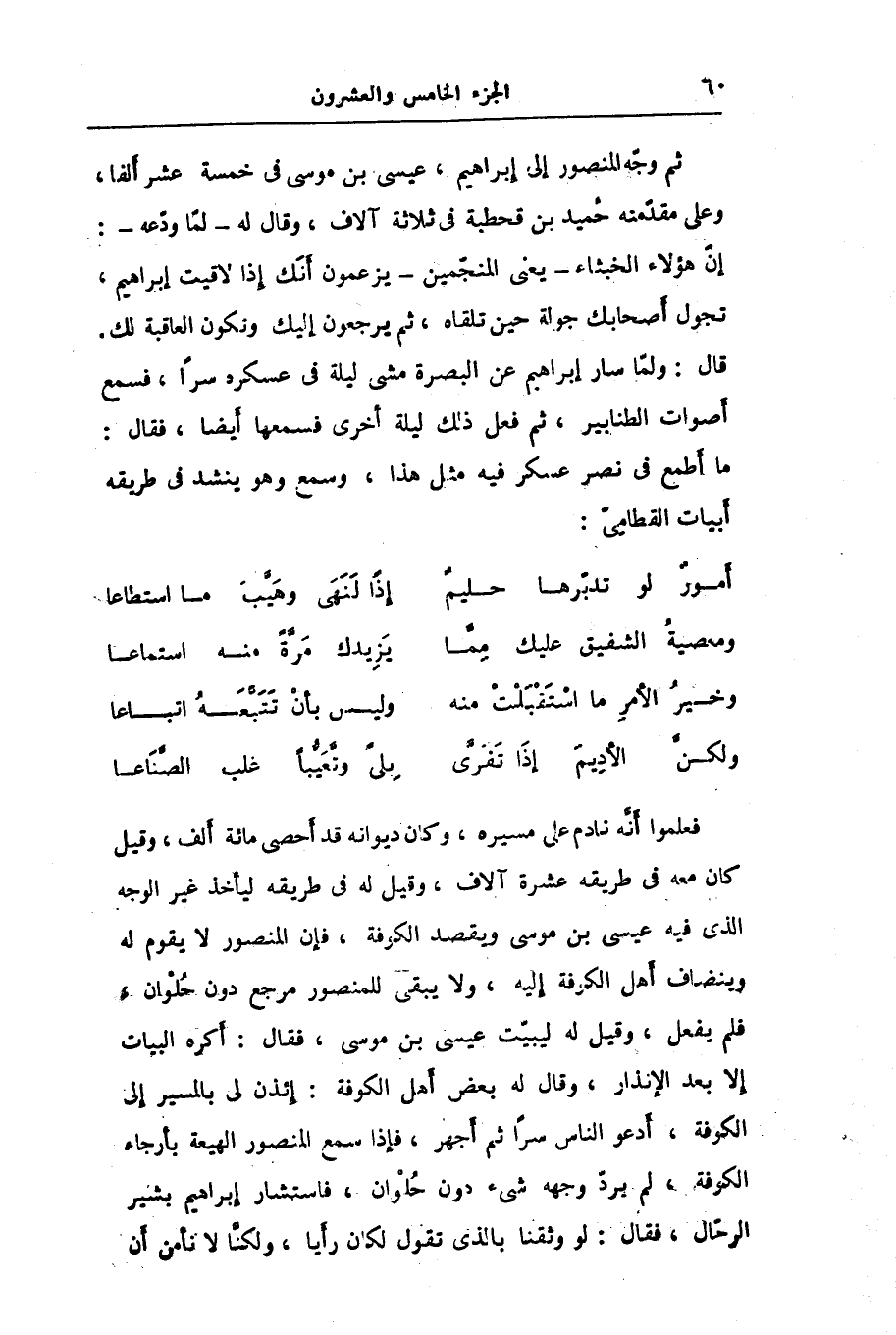 ما أطمع في نصر عسكر فيه مثل هذا، وسمع وهو ينشد في طريقه أبيات القطامىّ: