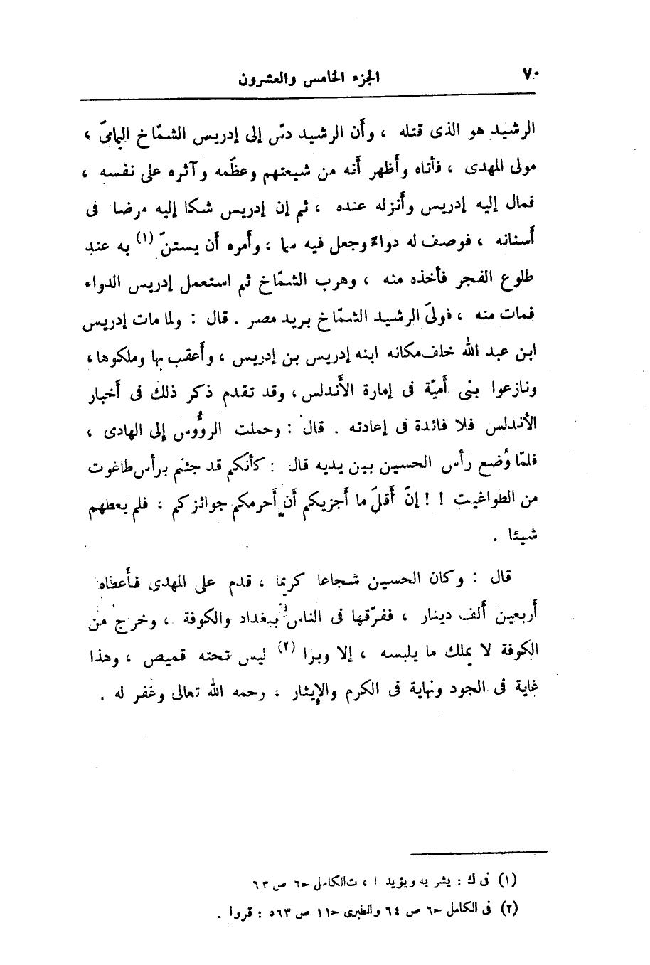 الرشيد هو الذى قتله، وأن الرشيد دسّ إلى إدريس الشمّاخ اليمامىّ، مولى المهدى، فأتاه وأظهر أنه من شيعتهم وعظمه وآثره على نفسه، فمال إليه إدريس وأنزله عنده، ثم إن إدريس شكا إليه مرضا في أسنانه، فوصف له دواء وجعل فيه سما، وأمره أن يستن «1» به عند طلوع الفجر فأخذه منه، وهرب الشمّاخ ثم استعمل إدريس الدواء فمات منه، فولى الرشيد الشمّاخ بريد مصر. قال: ولما مات إدريس ابن عبد الله خلف مكانه ابنه إدريس بن إدريس، وأعقب بها وملكوها، ونازعوا بنى أميّة في إمارة الأندلس، وقد تقدم ذكر ذلك في أخبار الأندلس فلا فائدة في إعادته. قال: وحملت الرؤوس إلى الهادى، فلمّا وضع رأس الحسين بين يديه قال: كأنّكم قد جئتم برأس طاغوت من الطواغيت!! إنّ أقلّ ما أجزيكم أن أحرمكم جوائزكم، فلم يعطهم شيئا.