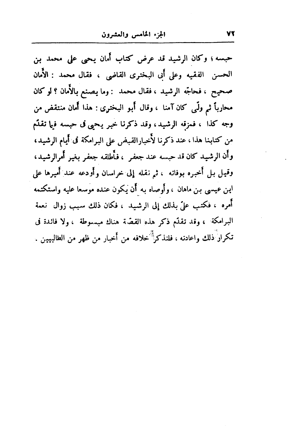 حبسه؛ وكان الرشيد قد عرض كتاب أمان يحيى على محمد بن الحسن الفقيه وعلى أبى البخترى القاضى، فقال محمد: الأمان صحيح، فحاجّه الرشيد، فقال محمد: وما يصنع بالأمان؟ لو كان محاربا ثم ولّى كان آمنا، وقال أبو البخترى: هذا أمان منتقض من وجه كذا، فمزقه الرشيد، وقد ذكرنا خبر يحيى في حبسه فيما تقدّم من كتابنا هذا، عند ذكرنا لأخبار القبض على البرامكة في أيام الرشيد، وأن الرشيد كان قد حبسه عند جعفر، فأطلقه جعفر بغير أمر الرشيد، وقيل بل أخبره بوفاته، ثم نقله إلى خراسان وأودعه عند أميرها على ابن عيسى بن ماهان، وأوصاه به أن يكون عنده موسعا عليه واستكتمه أمره، فكتب علىّ بذلك إلى الرشيد، فكان ذلك سبب زوال نعمة البرامكة، وقد تقدّم ذكر هذه القصّة هناك مبسوطة، ولا فائدة في تكرار ذلك واعادته، فلنذكر خلافه من أخبار من ظهر من الطالبيين.