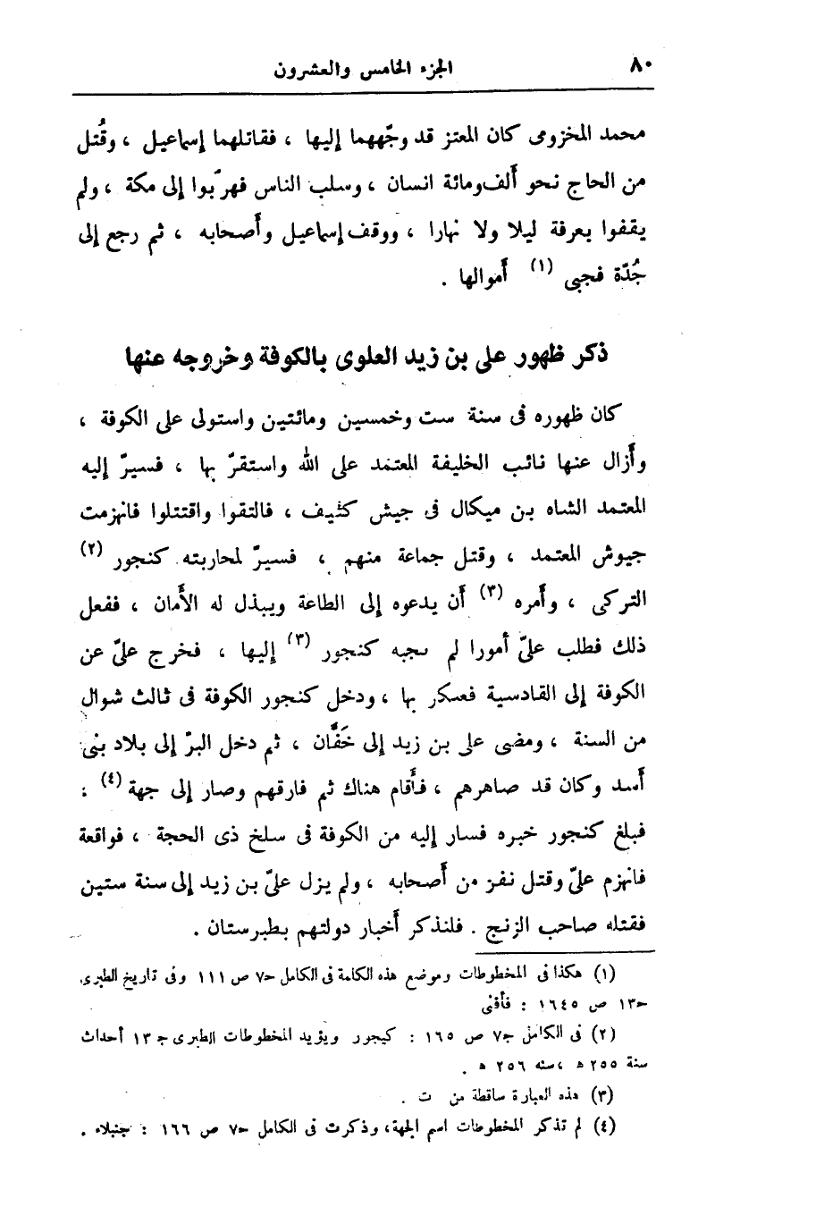 كان ظهوره في سنة ست وخمسين ومائتين واستولى على الكوفة، وأزال عنها نائب الخليفة المعتمد على الله واستقرّ بها، فسيّر إليه المعتمد الشاه بن ميكال في جيش كثيف، فالتقوا واقتتلوا فانهزمت جيوش المعتمد، وقتل جماعة منهم، فسيّر لمحاربته كنجور «2» التركى، وأمره «3» أن يدعوه إلى الطاعة ويبذل له الأمان، ففعل ذلك فطلب علىّ أمورا لم؟؟؟ نجبه كنجور «4» إليها، فخرج علىّ عن الكوفة إلى القادسية فعسكر بها، ودخل كنجور الكوفة في ثالث شوال من السنة، ومضى على بن زيد إلى خفّان، ثم دخل البرّ إلى بلاد بنى أسد وكان قد صاهرهم، فأقام هناك ثم فارقهم وصار إلى جهة «5» ، فبلغ كنجور خبره فسار إليه من الكوفة في سلخ ذى الحجة، فواقعة فانهزم علىّ وقتل نفر من أصحابه، ولم يزل علىّ بن زيد إلى سنة ستين فقتله صاحب الزنج. فلنذكر أخبار دولتهم بطبرستان.