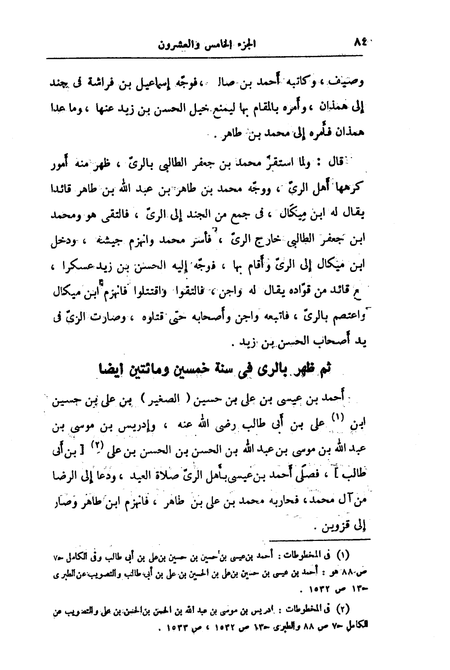أحمد بن عيسى بن على بن حسين (الصغير) بن على بن حسين ابن «1» على بن أبى طالب رضى الله عنه، وإدريس بن موسى بن عبد الله بن موسى بن عبد الله بن الحسن بن الحسن بن على «2» [بن أبى طالب] ، فصلى أحمد بن عيسى بأهل الرىّ صلاة العيد، ودعا إلى الرضا من آل محمد، فحاربه محمد بن على بن طاهر، فانهزم ابن طاهر وصار إلى قزوين.