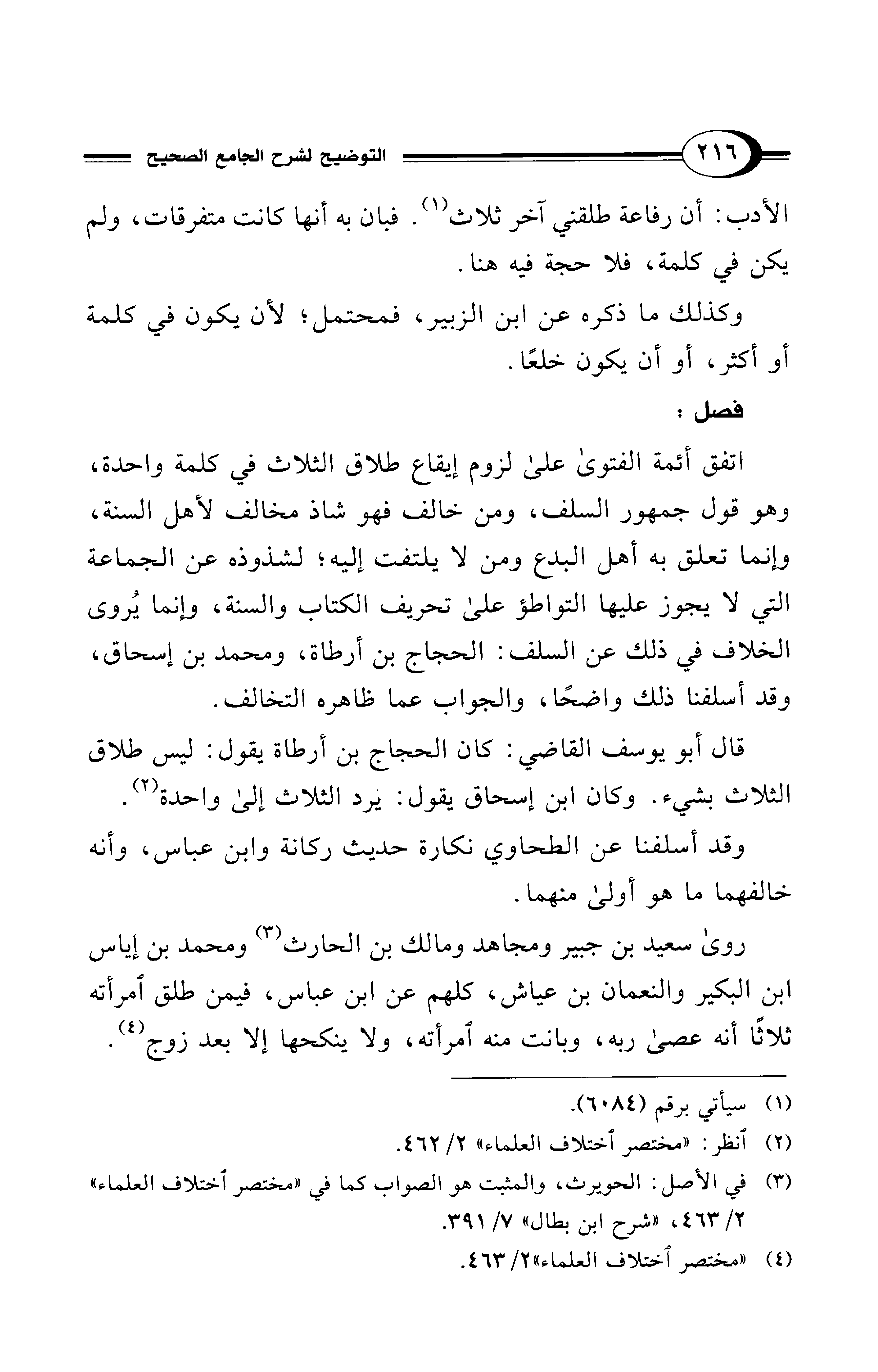 اتفق أئمة الفتوى على لزوم إيقاع طلاق الثلاث في كلمة واحدة، وهو قول جمهور السلف، ومن خالف فهو شاذ مخالف لأهل السنة، وإنما تعلق به أهل البدع ومن لا يلتفت إليه؛ لشذوذه عن الجماعة التي لا يجوز عليها التواطؤ على تحريف الكتاب والسنة، وإنما يُروى الخلاف في ذلك عن السلف: الحجاج بن أرطاة، ومحمد بن إسحاق، وقد أسلفنا ذلك واضحًا، والجواب عما ظاهره التخالف.