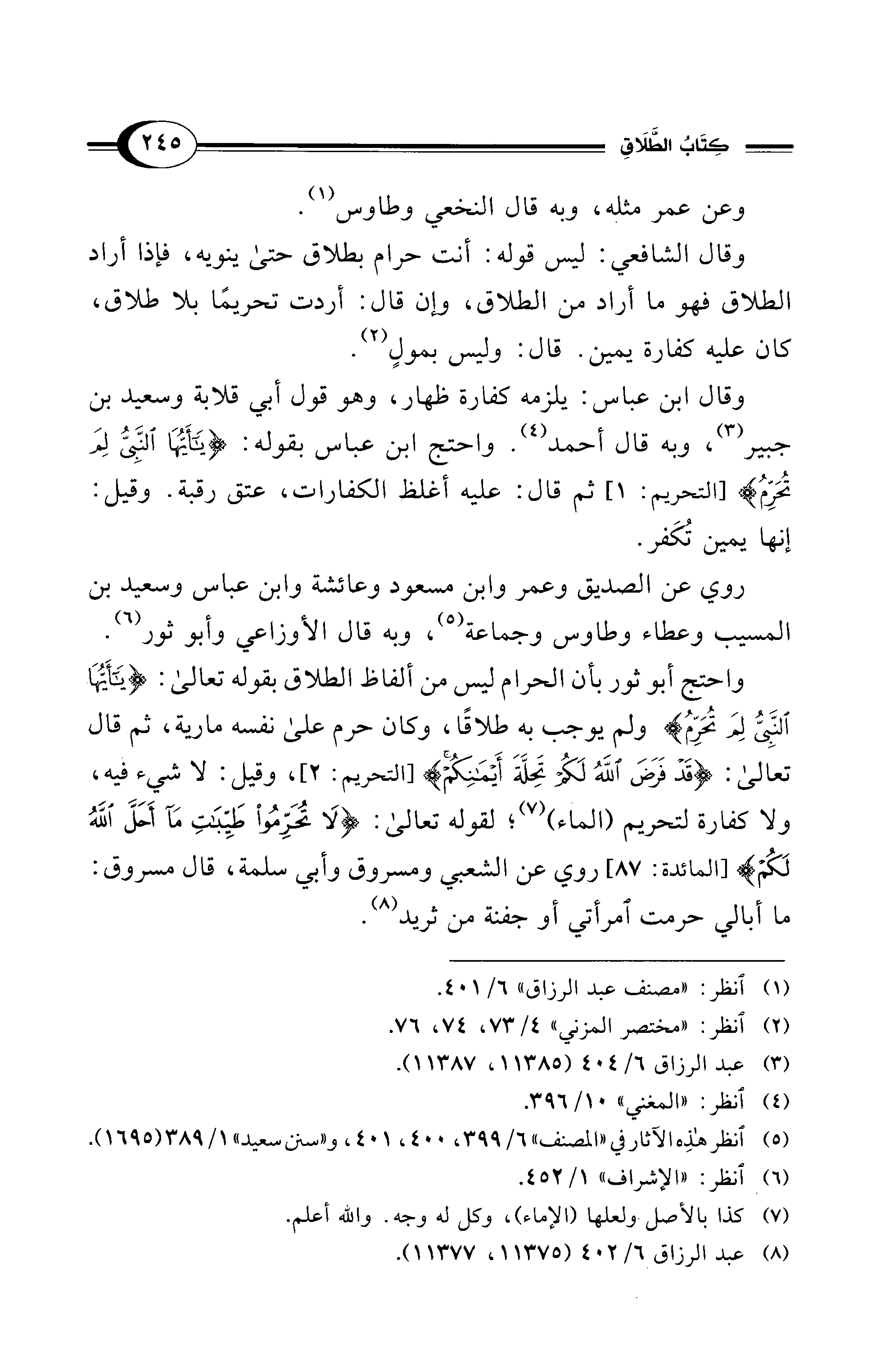واحتج أبو ثور بأن الحرام ليس من ألفاظ الطلاق بقوله تعالى: في {يَا أَيُّهَا النَّبِيُّ لِمَ تُحَرِّمُ} ولم يوجب به طلاقًا، وكان حرم على نفسه مارية، ثم قال تعالى: {قَدْ فَرَضَ اللهُ لَكُمْ تَحِلَّةَ أَيْمَانِكُمْ} [التحريم: 2]، وقيل: لا شيء فيه، ولا كفارة لتحريم (الماء) (¬7)؛ لقوله تعالى: {لَا تُحَرِّمُوا طَيِّبَاتِ مَا أَحَلَّ اللهُ لَكُمْ} [المائدة: 87] روي عن الشعبي ومسروق وأبي سلمة، قال مسروق: ما أبالي حرمت امرأتي أو جفنة من ثريد (¬8).