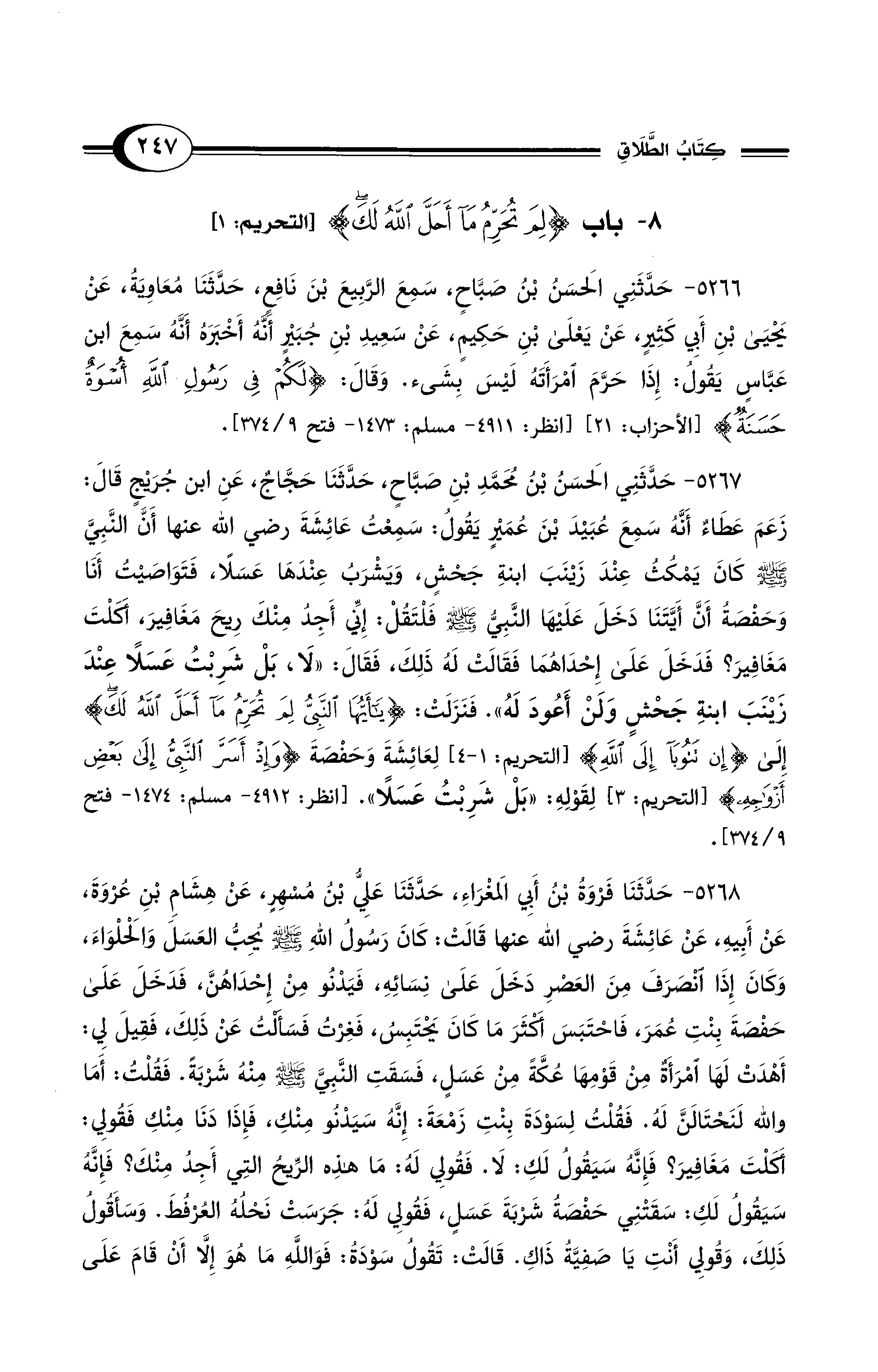 5266 - حَدَّثَنِي الْحَسَنُ بْنُ صَبَّاحٍ, سَمِعَ الرَّبِيعَ بْنَ نَافِعٍ, حَدَّثَنَا مُعَاوِيَةُ, عَنْ يَحْيَى بْنِ أَبِي كَثِيرٍ, عَنْ يَعْلَى بْنِ حَكِيمٍ, عَنْ سَعِيدِ بْنِ جُبَيْرٍ أَنَّهُ أَخْبَرَهُ أَنَّهُ سَمِعَ ابْنَ عَبَّاسٍ يَقُولُ: إِذَا حَرَّمَ امْرَأَتَهُ لَيْسَ بِشَيْءٍ. وَقَالَ: {لَكُمْ فِي رَسُولِ اللَّهِ أُسْوَةٌ حَسَنَةٌ} [الأحزاب: 21]. [انظر: 4911 - مسلم: 1473 - فتح 9/ 374].