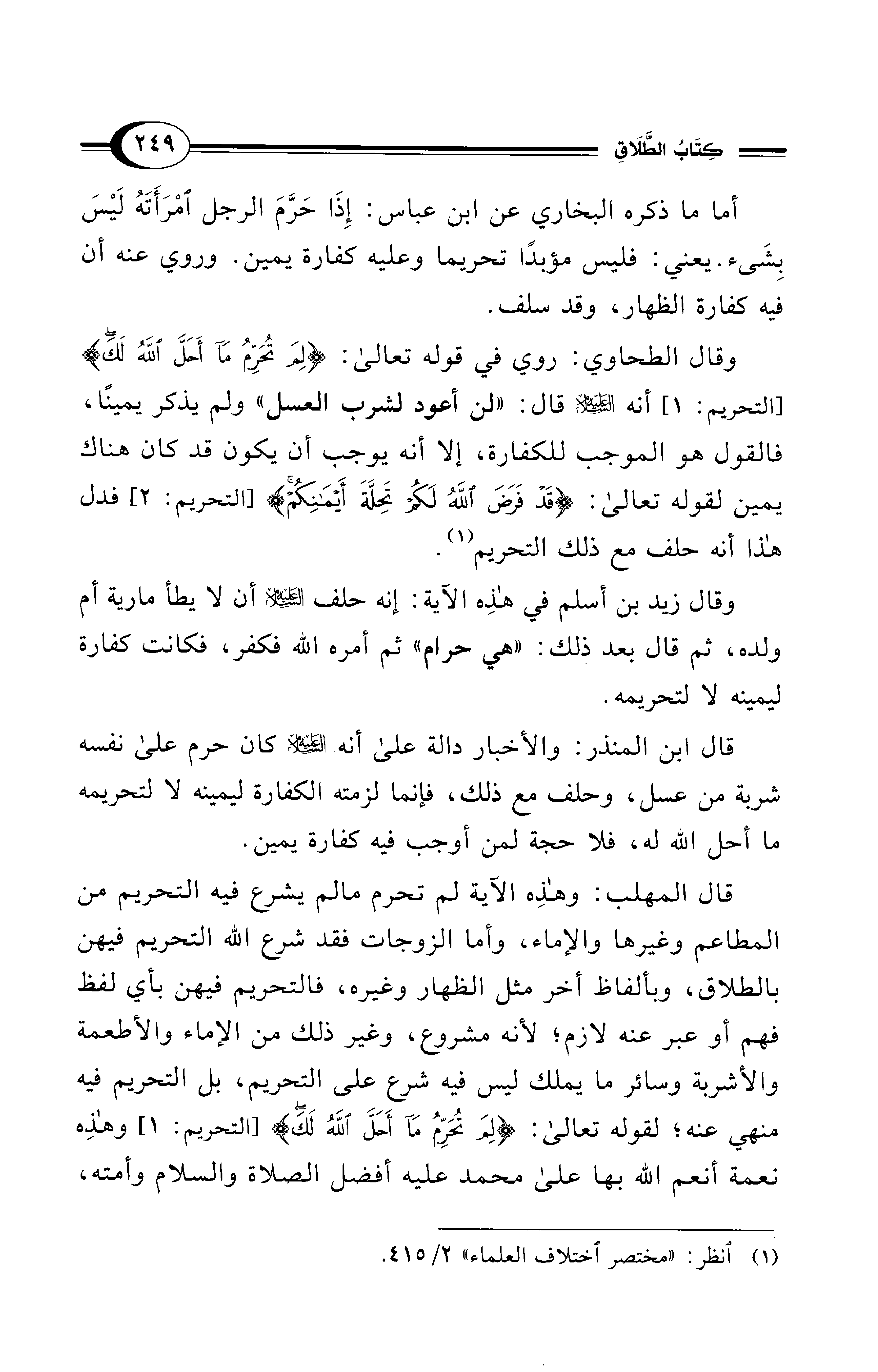 وقال الطحاوي: روي في قوله تعالى: {لِمَ تُحَرِّمُ مَا أَحَلَّ اللهُ لَكَ} [التحريم: 1] أنه - عليه السلام - قال: "لن أعود لشرب العسل" ولم يذكر يمينًا، فالقول هو الموجب للكفارة، إلا أنه يوجب أن يكون قد كان هناك يمين لقوله تعالى: {قَدْ فَرَضَ اللهُ لَكُمْ تَحِلَّةَ أَيْمَانِكُمْ} [التحريم: 2] فدل هذا أنه حلف مع ذلك التحريم (¬1).