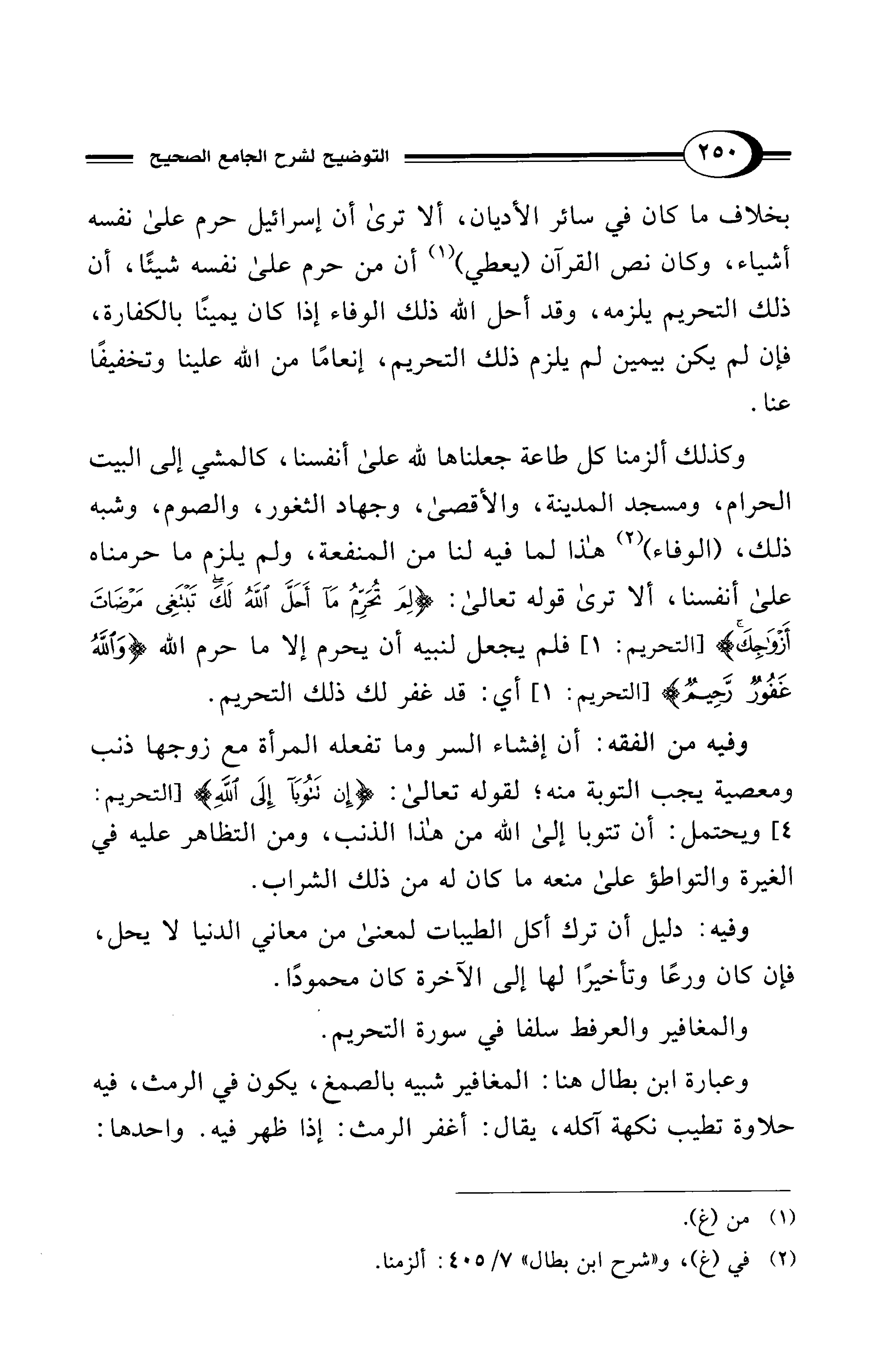 وكذلك ألزمنا كل طاعة جعلناها لله علي أنفسنا، كالمشي إلى البيت الحرام، ومسجد المدينة، والأقصى، وجهاد الثغور، والصوم، وشبه ذلك، (الوفاء) (¬2) هذا لما فيه لنا من المنفعة، ولم يلزم ما حرمناه علي أنفسنا، ألا ترى قوله تعالى: {لِمَ تُحَرِّمُ مَا أَحَلَّ اللهُ لَكَ تَبْتَغِي مَرْضَاتَ أَزْوَاجِكَ} [التحريم: 1] فلم يجعل لنبيه أن يحرم إلا ما حرم الله {وَاللهُ غَفُورٌ رَحِيمٌ} [التحريم: 1] أي: قد غفر لك ذلك التحريم.