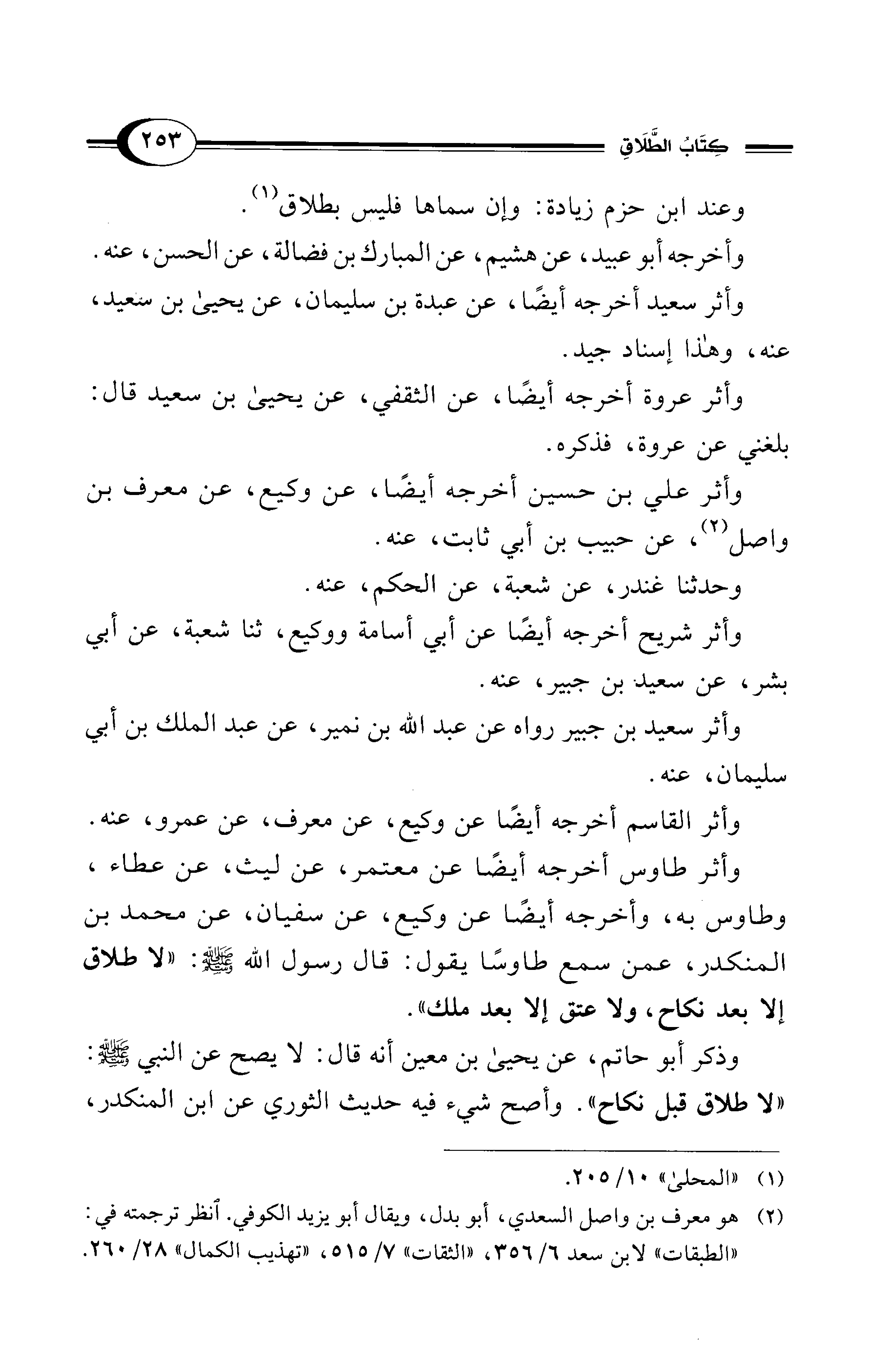 وأثر طاوس أخرجه أيضًا عن معتمر، عن ليث، عن عطاء، وطاوس به، وأخرجه أيضًا عن وكيع، عن سفيان، عن محمد بن المنكدر، عمن سمع طاوسًا يقول: قال رسول الله - صلى الله عليه وسلم -: "لا طلاق إلا بعد نكاح، ولا عتق إلا بعد ملك".