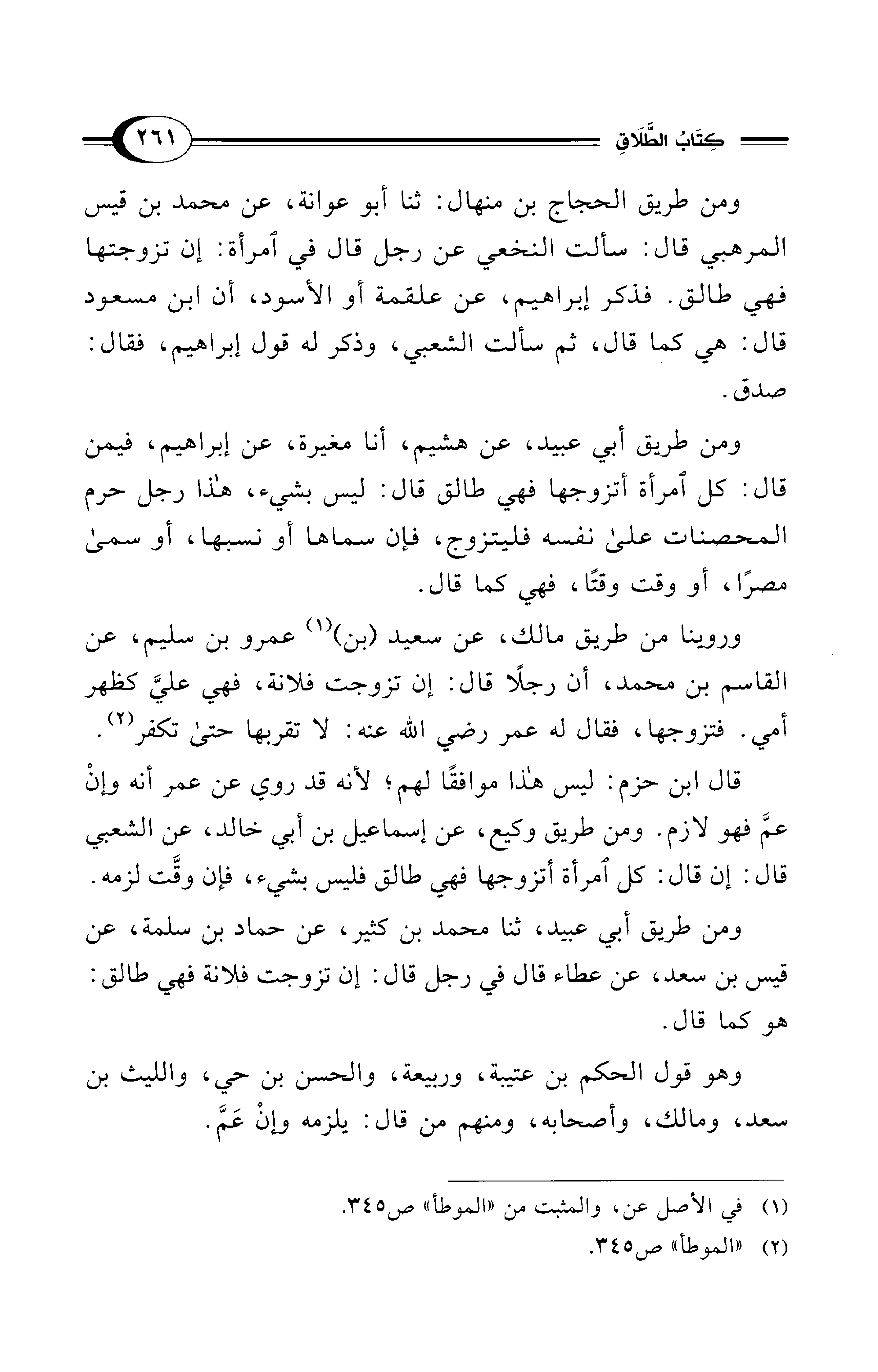 ومن طريق أبي عبيد، عن هشيم، أنا مغيرة، عن إبراهيم، فيمن قال: كل امرأة أتزوجها فهي طالق قال: ليس بشيء، هذا رجل حرم المحصنات علي نفسه فليتزوج، فإن سماها أو نسبها، أو سمى مصرًا، أو وقت وقتًا، فهي كما قال.