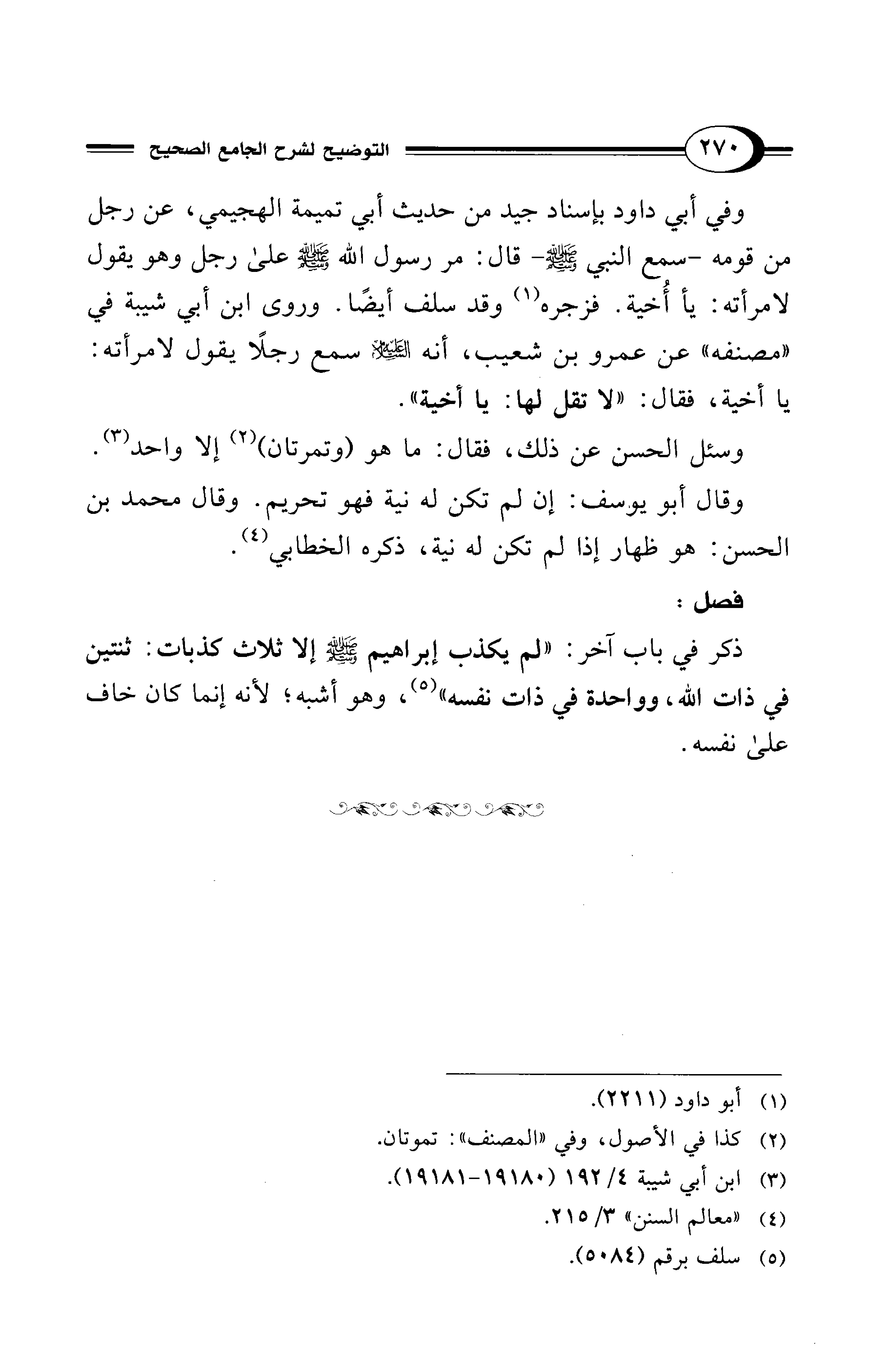 ذكر في باب آخر: "لم يكذب إبراهيم - صلى الله عليه وسلم - إلا ثلاث كذبات: ثنتين في ذات الله، وواحدة في ذات نفسه" (¬5)، وهو أشبه؛ لأنه إنما كان خاف علي نفسه.