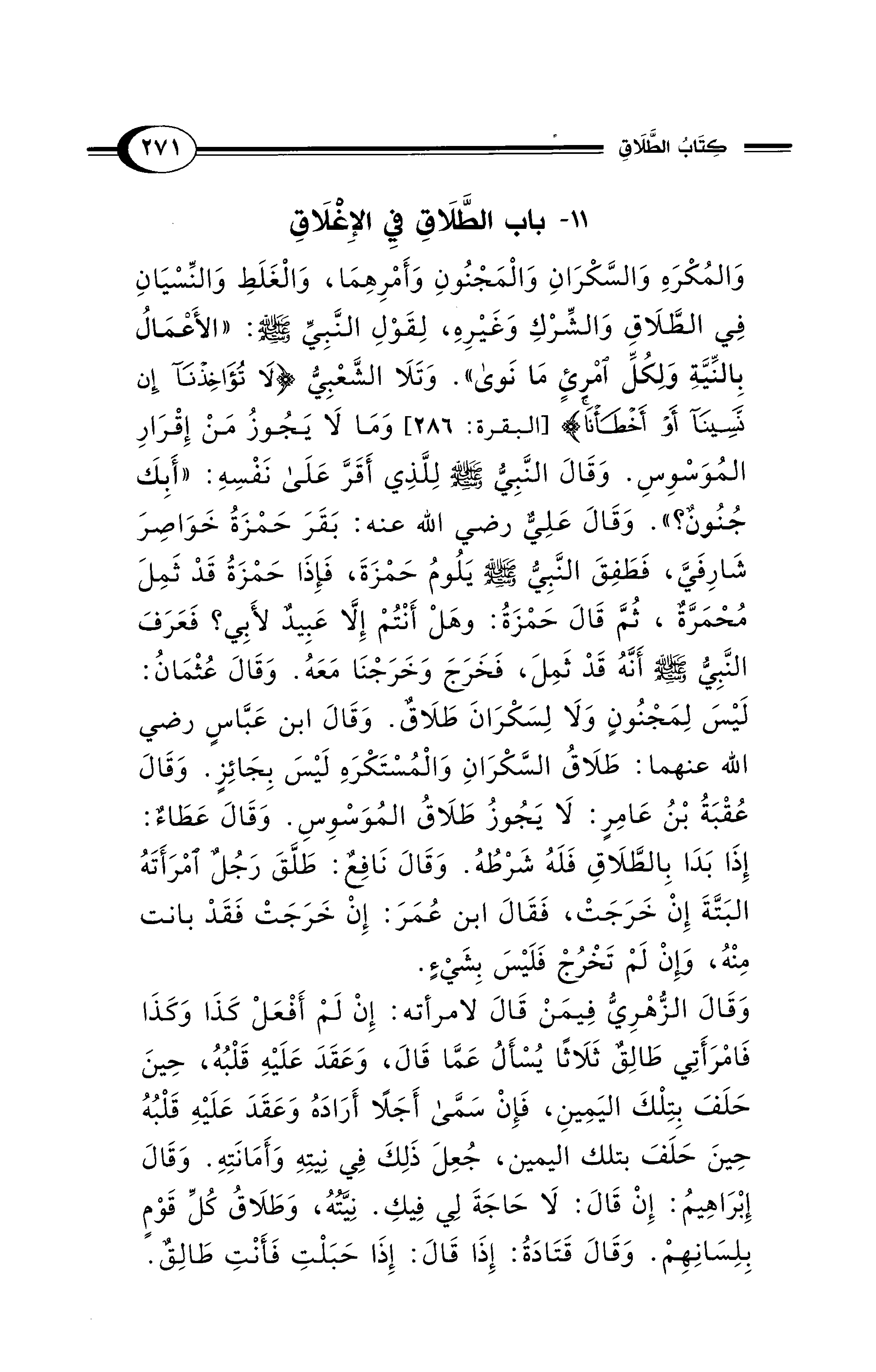 وَالْكُرْهِ وَالسَّكْرَانِ وَالْمَجْنُونِ وَأَمْرِهِمَا، وَالْغَلَطِ وَالنِّسْيَانِ فِى الطَّلاَقِ وَالشِّرْكِ وَغَيْرِهِ، لِقَوْلِ النَّبِيِّ - صلى الله عليه وسلم -: «الأَعْمَالُ بِالنِّيَّةِ وَلِكُلِّ امْرِئٍ مَا نَوَى». وَتَلاَ الشَّعْبِيُّ {رَبَّنَا لَا تُؤَاخِذْنَا إِنْ نَسِينَا أَوْ أَخْطَأْنَا} [البقرة: 286] وَمَا لاَ يَجُوزُ مَنْ إِقْرَارِ الْمُوَسْوِسِ. وَقَالَ النَّبِيُّ - صلى الله عليه وسلم - لِلَّذِي أَقَرَّ عَلَى نَفْسِهِ: «أَبِكَ جُنُونٌ؟». وَقَالَ عَلِيٌّ - رضي الله عنه -: بَقَرَ حَمْزَةُ خَوَاصِرَ شَارِفَيَّ، فَطَفِقَ النَّبِيُّ - صلى الله عليه وسلم - يَلُومُ حَمْزَةَ، فَإِذَا حَمْزَةُ قَدْ ثَمِلَ مُحْمَرَّةٌ عَيْنَاهُ، ثُمَّ قَالَ حَمْزَةُ: هَلْ أَنْتُمْ إِلاَّ عَبِيدٌ لأَبِي؟ فَعَرَفَ النَّبِيُّ - صلى الله عليه وسلم - أَنَّهُ قَدْ ثَمِلَ، فَخَرَجَ وَخَرَجْنَا مَعَهُ، وَقَالَ عُثْمَانُ: لَيْسَ لِمَجْنُونٍ وَلاَ لِسَكْرَانَ طَلاَقٌ. وَقَالَ ابْنُ عَبَّاسٍ - رضي الله عنهما -: طَلاَقُ السَّكْرَانِ وَالْمُسْتَكْرَهِ لَيْسَ بِجَائِزٍ. وَقَالَ عُقْبَةُ بْنُ عَامِرٍ: لاَ يَجُوزُ طَلاَقُ الْمُوَسْوِسِ. وَقَالَ عَطَاءٌ: إِذَا بَدَا بِالطَّلاَقِ فَلَهُ شَرْطُهُ. وَقَالَ نَافِعٌ: طَلَّقَ رَجُلٌ امْرَأَتَهُ الْبَتَّةَ إِنْ خَرَجَتْ، فَقَالَ ابْنُ عُمَرَ: إِنْ خَرَجَتْ فَقَدْ بُتَّتْ مِنْهُ، وَإِنْ لَمْ تَخْرُجْ فَلَيْسَ بِشَىْءٍ.