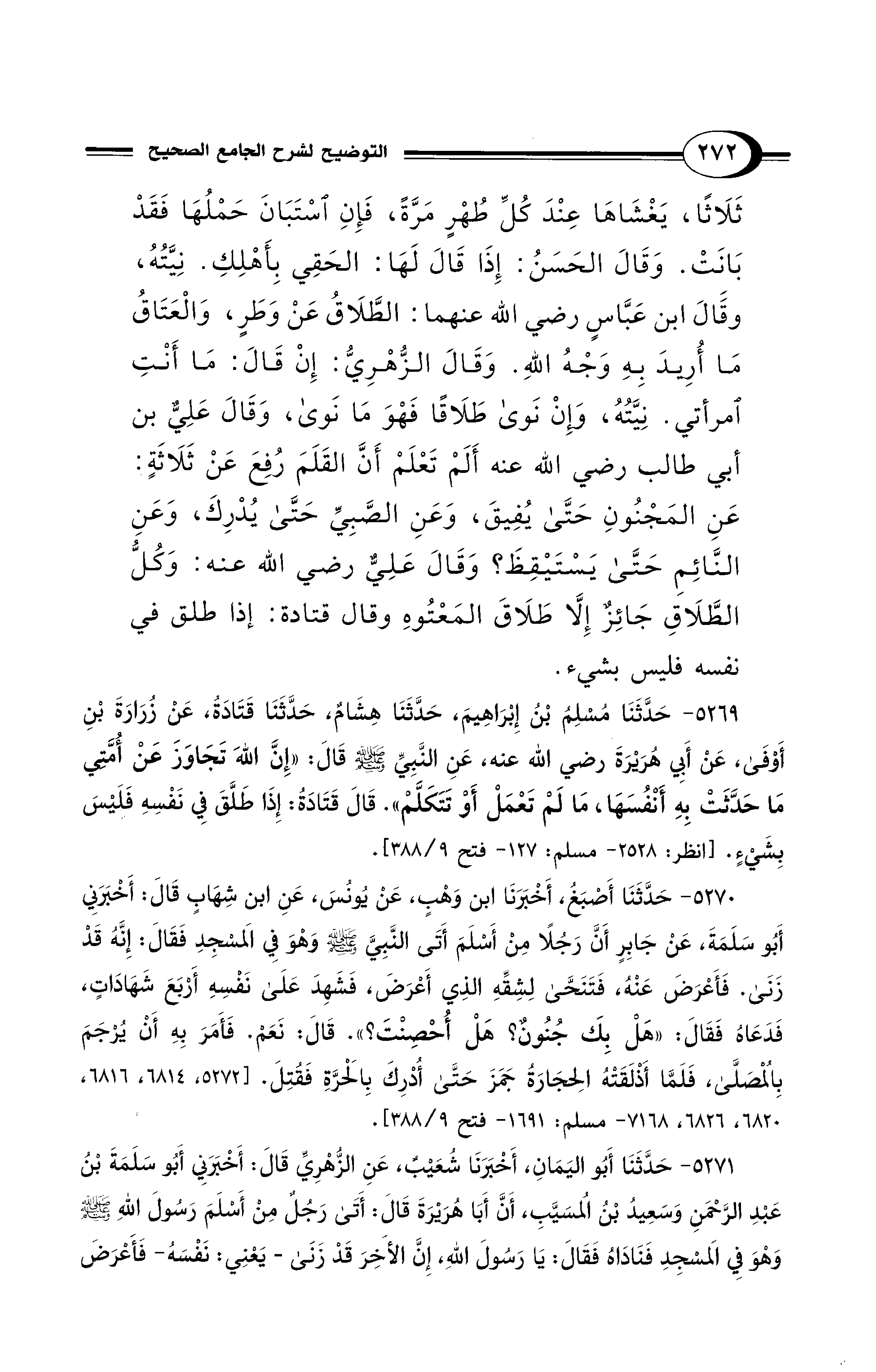 5269 - حَدَّثَنَا مُسْلِمُ بْنُ إِبْرَاهِيمَ, حَدَّثَنَا هِشَامٌ, حَدَّثَنَا قَتَادَةُ, عَنْ زُرَارَةَ بْنِ أَوْفَى, عَنْ أَبِي هُرَيْرَةَ - رضي الله عنه - عَنِ النَّبِيِّ - صلى الله عليه وسلم - قَالَ: «إِنَّ اللهَ تَجَاوَزَ عَنْ أُمَّتِي مَا حَدَّثَتْ بِهِ أَنْفُسَهَا، مَا لَمْ تَعْمَلْ أَوْ تَتَكَلَّمْ». قَالَ قَتَادَةُ: إِذَا طَلَّقَ فِي نَفْسِهِ فَلَيْسَ بِشَيْءٍ. [انظر: 2528 - مسلم: 127 - فتح 9/ 388].
