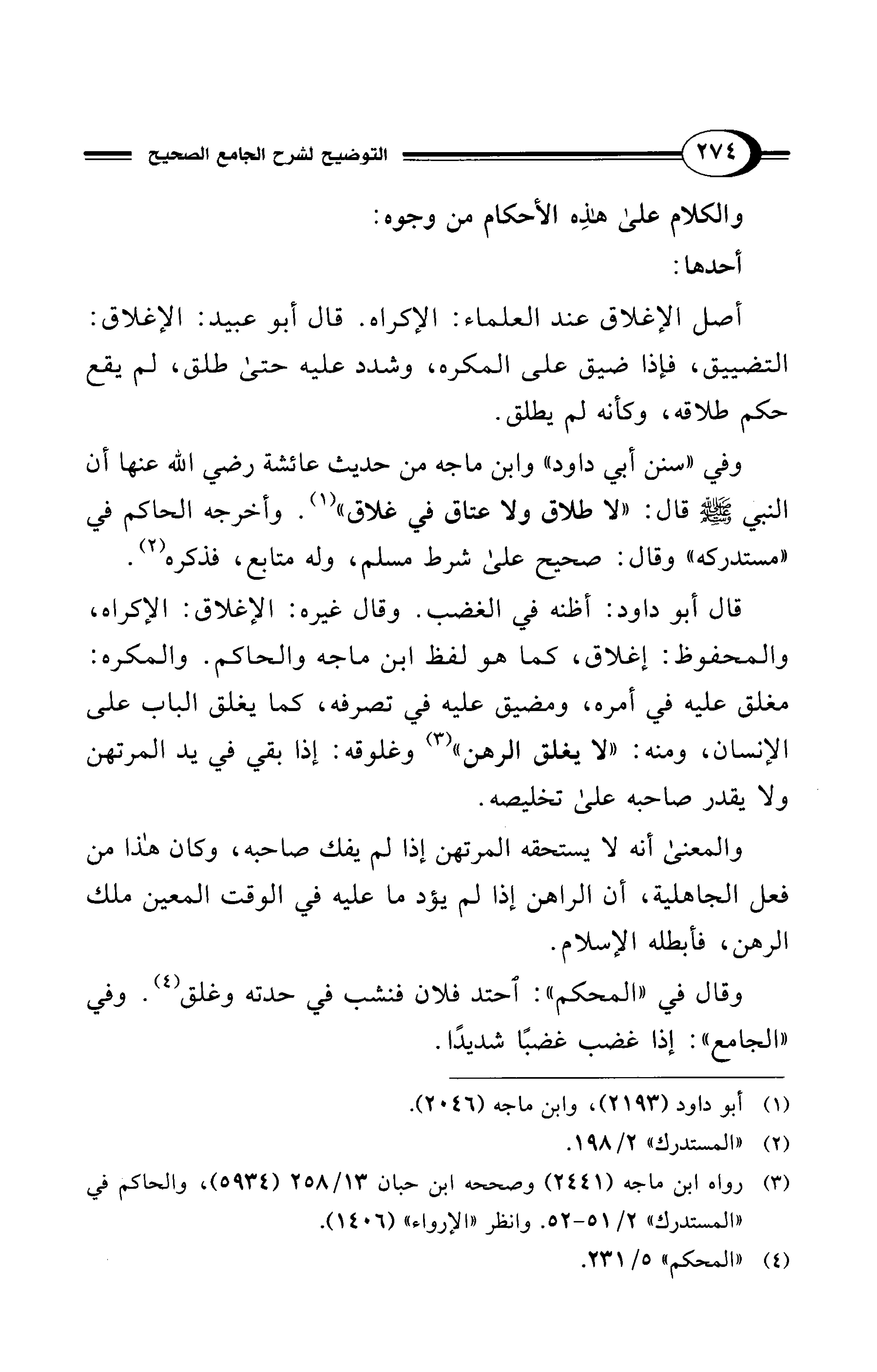 قال أبو داود: أظنه في الغضب. وقال غيره: الإغلاق: الإكراه، والمحفوظ: إغلاق، كما هو لفظ ابن ماجه والحاكم. والمكره: مغلق عليه في أمره، ومضيق عليه في تصرفه، كما يغلق الباب على الإنسان، ومنه: "لا يغلق الرهن" (¬3) وغلوقه: إذا بقي في يد المرتهن ولا يقدر صاحبه علي تخليصه.