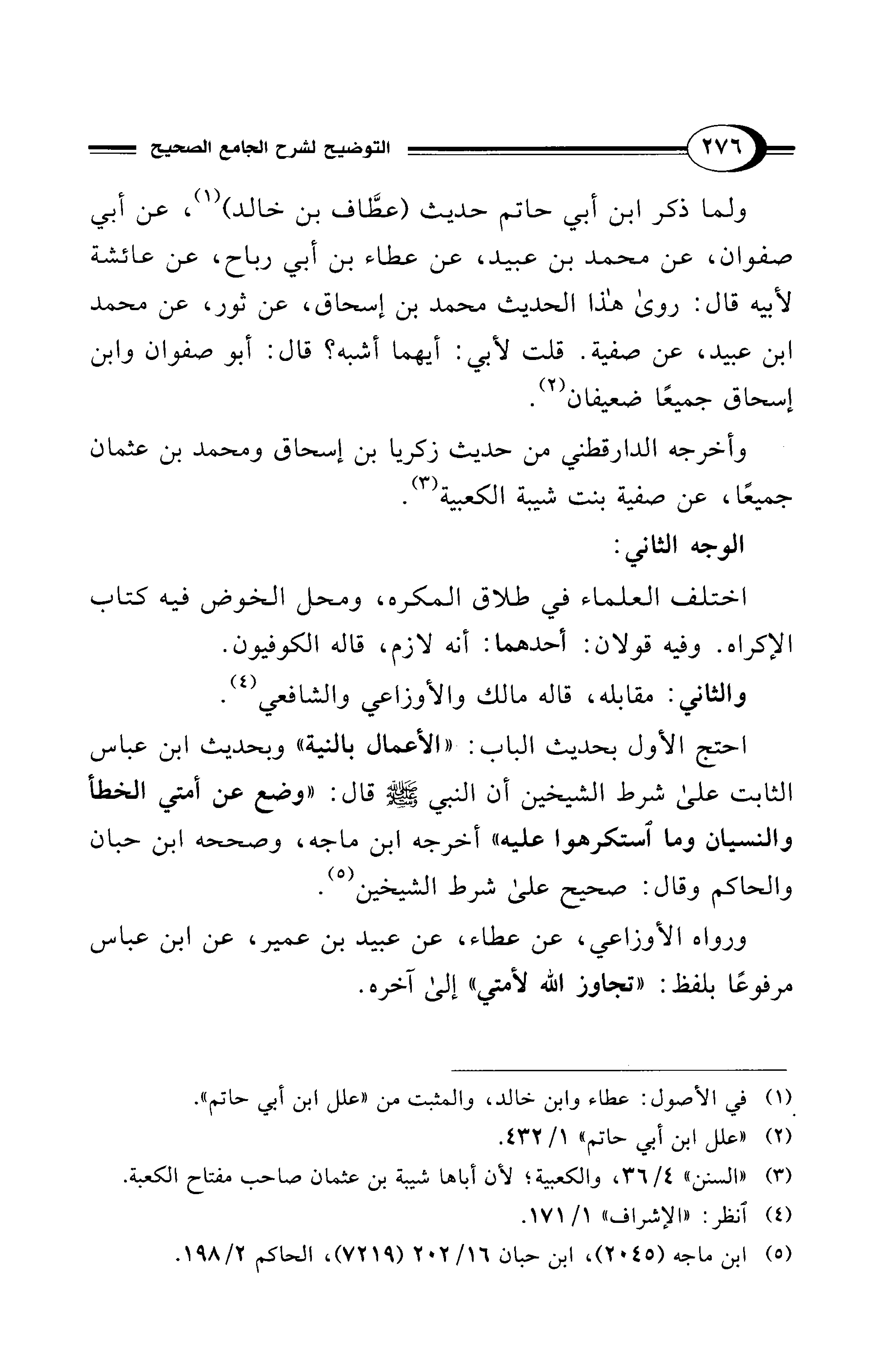 احتج الأول بحديث الباب: "الأعمال بالنية" وبحديث ابن عباس الثابت علي شرط الشيخين أن النبي - صلى الله عليه وسلم - قال: "وضع عن أمتي الخطأ والنسيان وما استكرهوا عليه" أخرجه ابن ماجه، وصححه ابن حبان والحاكم وقال: صحيح علي شرط الشيخين (¬5).
