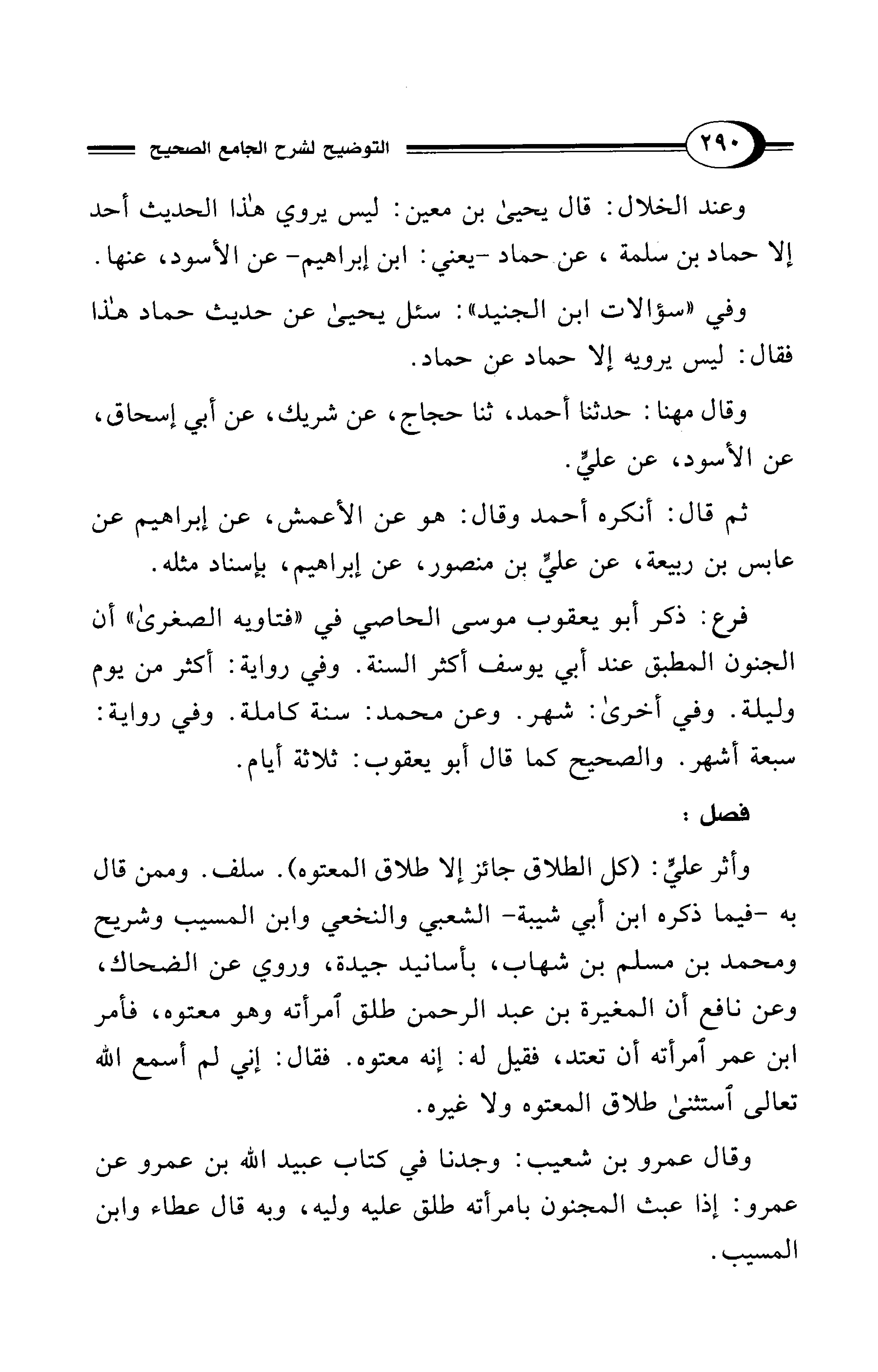 وأثر عليٍّ: (كل الطلاق جائز إلا طلاق المعتوه). سلف. وممن قال به -فيما ذكره ابن أبي شيبة- الشعبي والنخعي وابن المسيب وشريح ومحمد بن مسلم بن شهاب، بأسانيد جيدة، وروي عن الضحاك، وعن نافع أن المغيرة بن عبد الرحمن طلق امرأته وهو معتوه، فأمر ابن عمر امرأته أن تعتد، فقيل له: إنه معتوه. فقال: إني لم أسمع الله تعالى استثنى طلاق المعتوه ولا غيره.