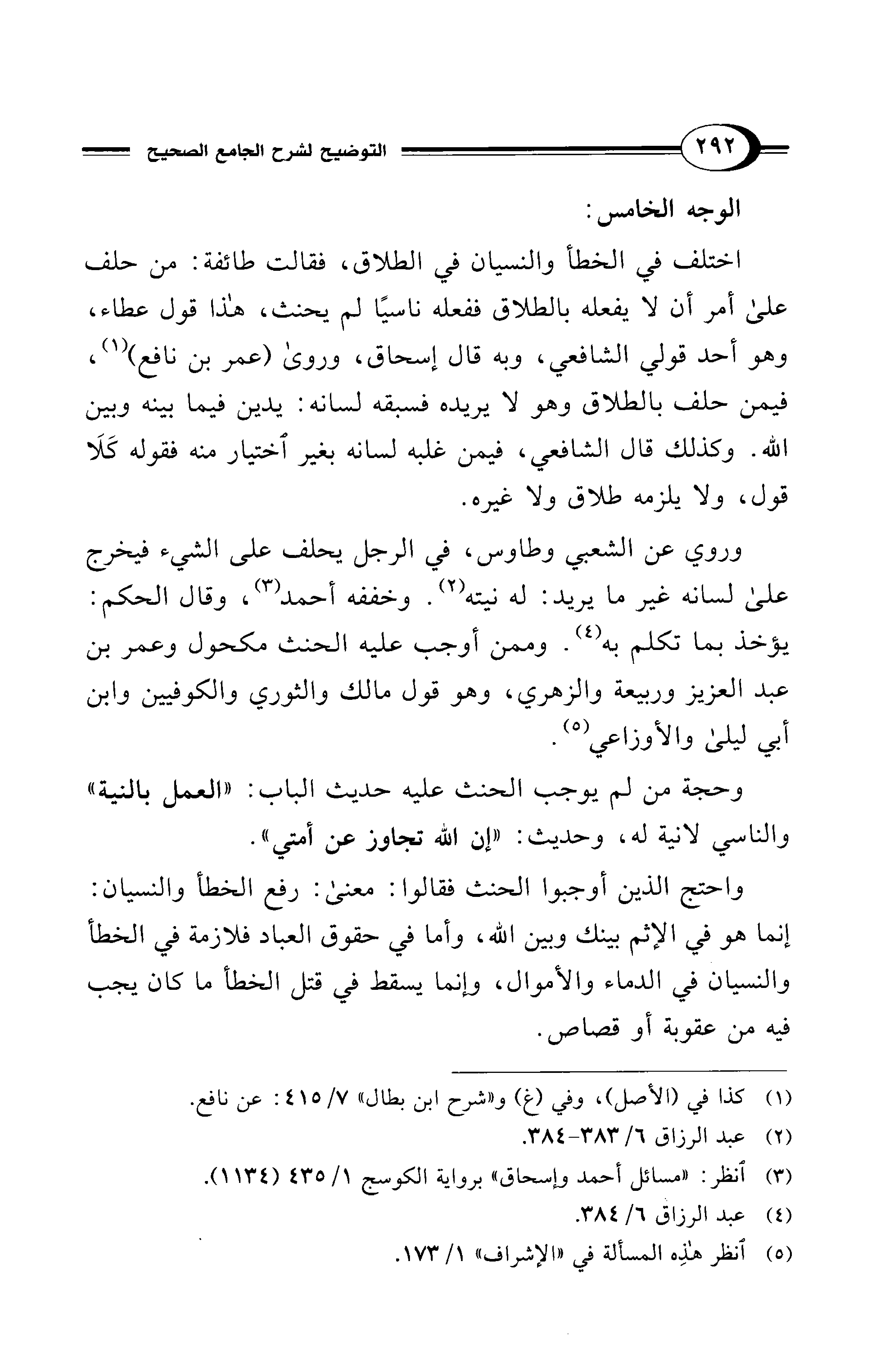 اختلف في الخطأ والنسيان في الطلاق، فقالت طائفة: من حلف علي أمر أن لا يفعله بالطلاق ففعله ناسيًا لم يحنث، هذا قول عطاء، وهو أحد قولي الشافعي، وبه قال إسحاق، وروى (عمر بن نافع) (¬1)، فيمن حلف بالطلاق وهو لا يريده فسبقه لسانه: يدين فيما بينه وبين الله. وكذلك قال الشافعي، فيمن غلبه لسانه بغير اختيار منه فقوله كَلَا قول، ولا يلزمه طلاق ولا غيره.