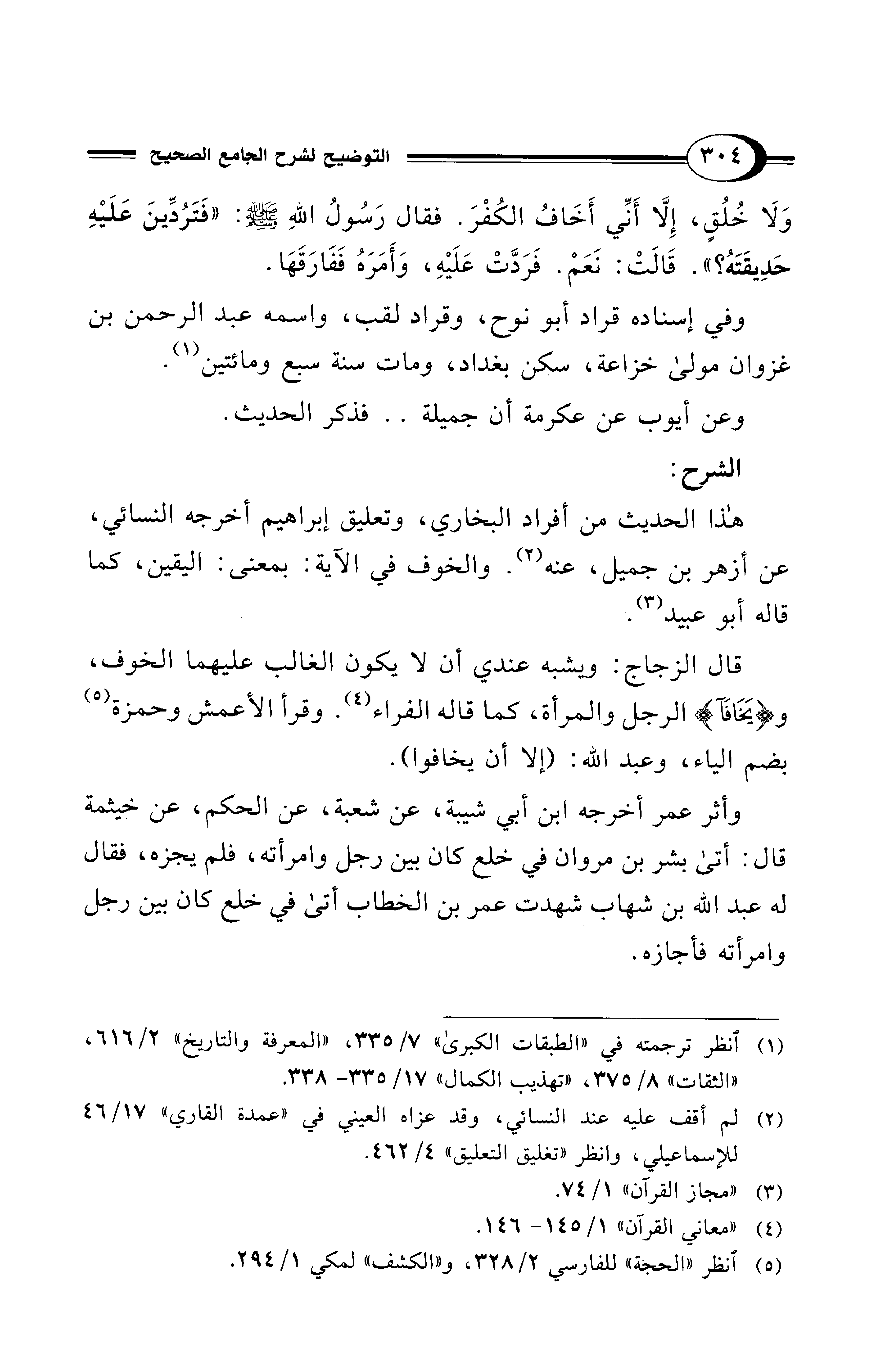 وَلَا خُلُقٍ، إِلَّا أَنِّي أَخَافُ الكُفْرَ. فقال رَسُولُ اللهِ - صلى الله عليه وسلم -: "فَتَرُدِّينَ عَلَيْهِ حَدِيقَتَهُ؟ ". قَالَتْ: نَعَمْ. فَرَدَّتْ عَلَيْهِ، وَأَمَرَهُ فَفَارَقَهَا.