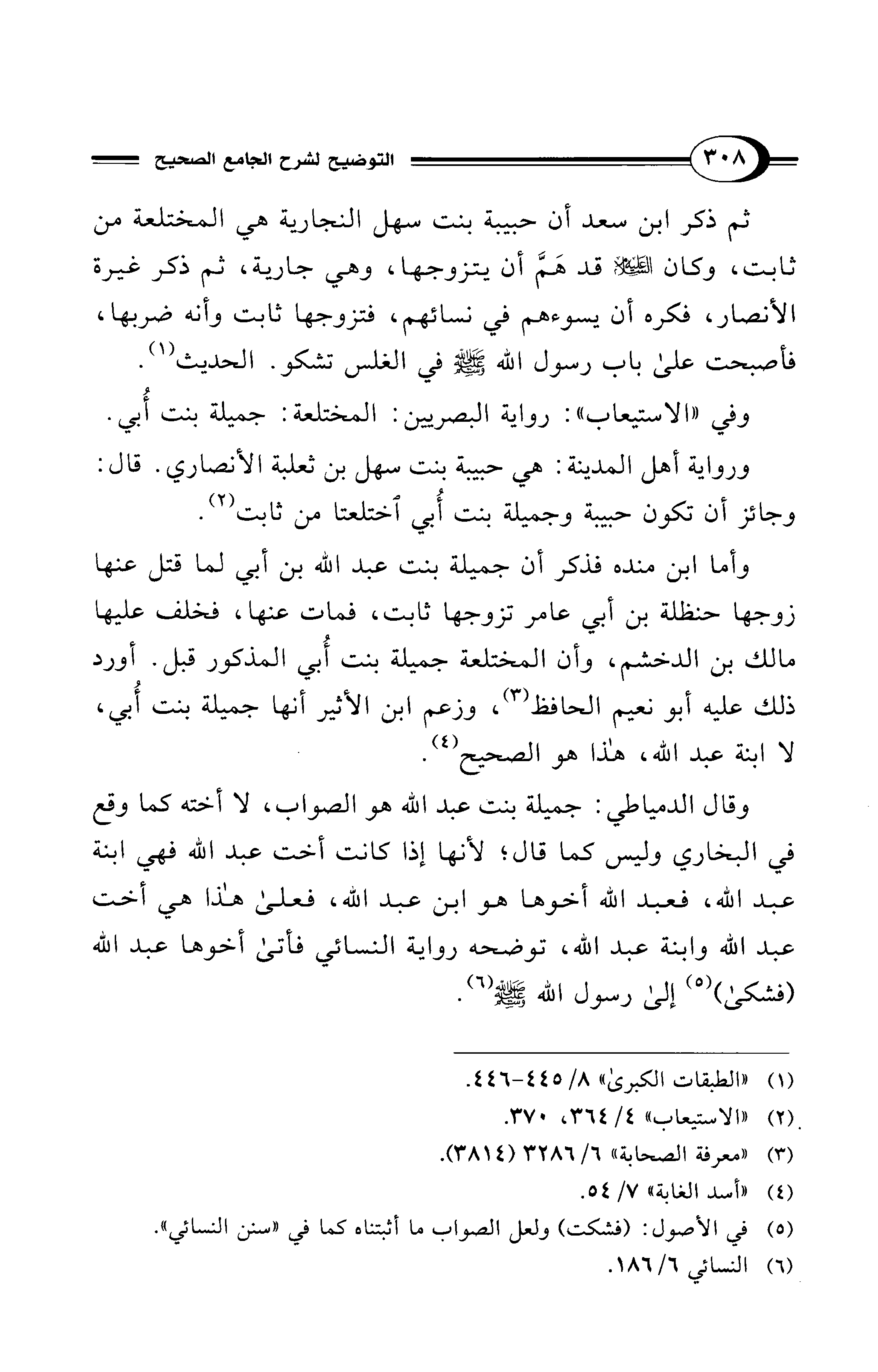وقال الدمياطي: جميلة بنت عبد الله هو الصواب، لا أخته كما وقع في البخاري وليس كما قال؛ لأنها إذا كانت أخت عبد الله فهي ابنة عبد الله، فعبد الله أخوها هو ابن عبد الله، فعلى هذا هي أخت عبد الله وابنة عبد الله، توضحه رواية النسائي فأتى أخوها عبد الله (فشكي) (¬5) إلى رسول الله - صلى الله عليه وسلم - (¬6).