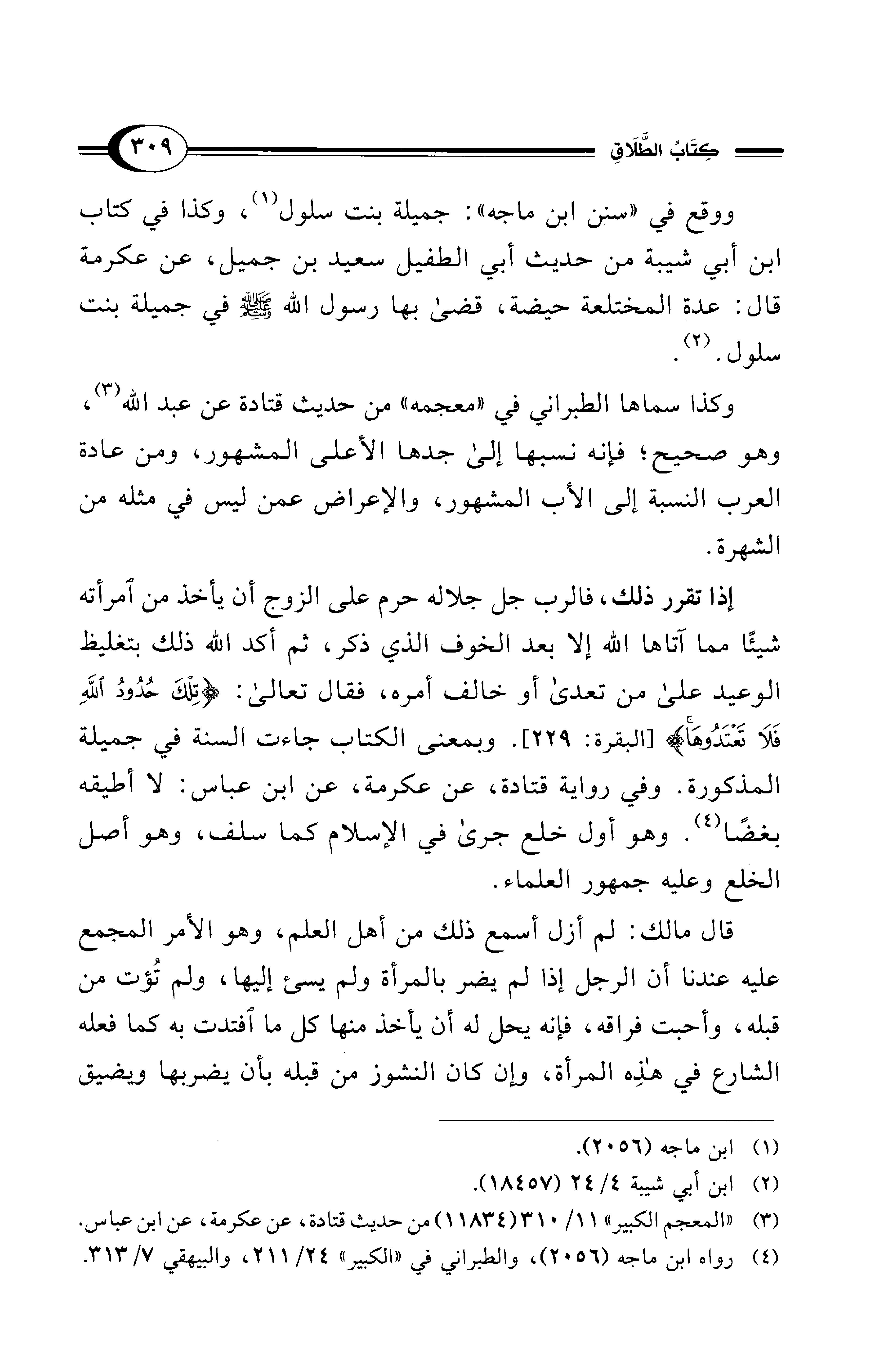 إذا تقرر ذلك، فالرب جل جلاله حرم على الزوج أن يأخذ من امرأته شيئًا مما آتاها الله إلا بعد الخوف الذي ذكر، ثم أكد الله ذلك بتغليظ الوعيد على من تعدى أو خالف أمره، فقال تعالى: {تِلْكَ حُدُودُ اللهِ فَلَا تَعْتَدُوهَا} [البقرة: 229]. وبمعنى الكتاب جاءت السنة في جميلة المذكورة. وفي رواية قتادة، عن عكرمة، عن ابن عباس: لا أطيقه بغضًا (¬4). وهو أول خلع جرى في الإسلام كما سلف، وهو أصل الخلع وعليه جمهور العلماء.