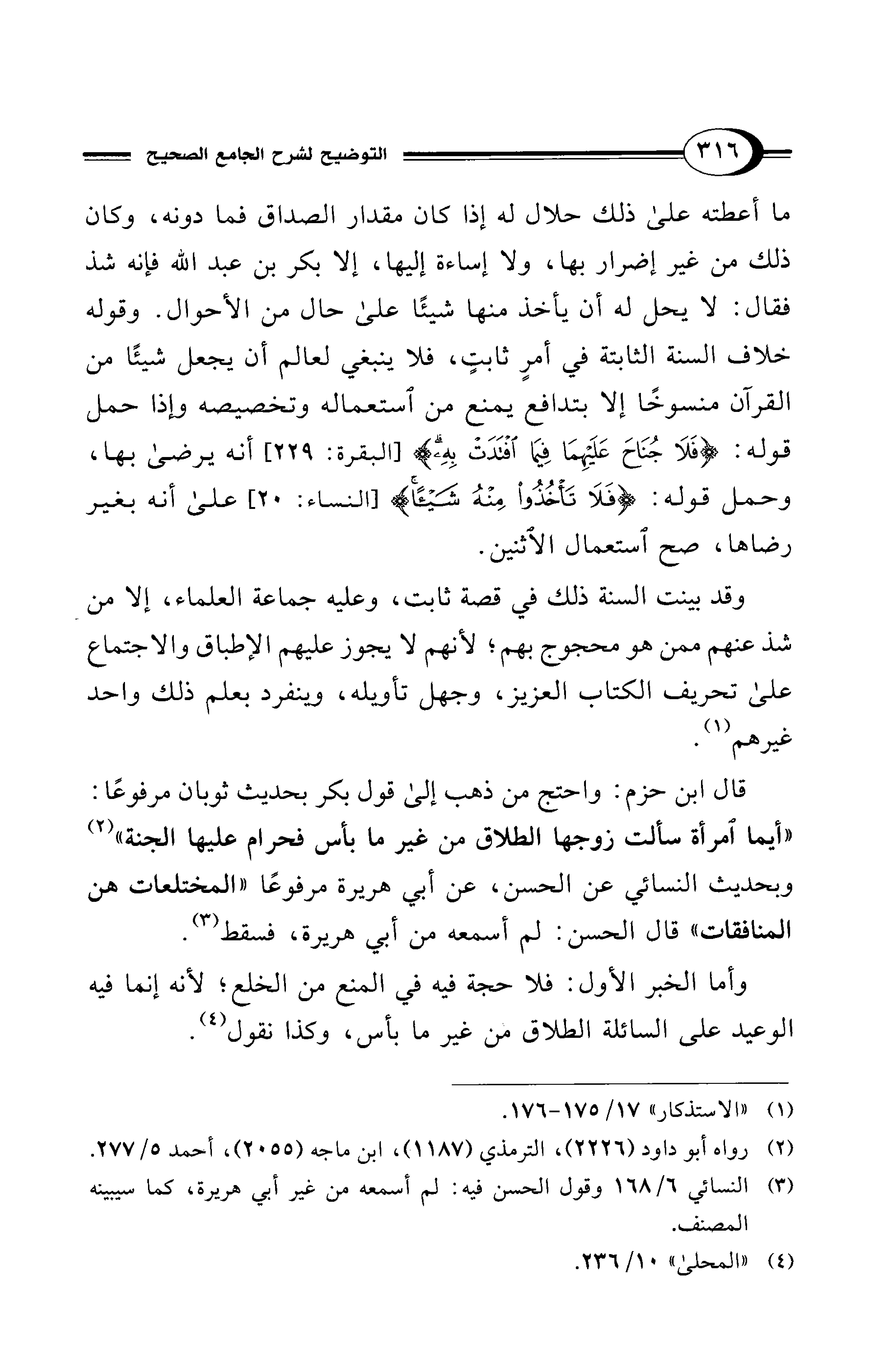 قال ابن حزم: واحتج من ذهب إلى قول بكر بحديث ثوبان مرفوعًا: "أيما امرأة سألت زوجها الطلاق من غير ما بأس فحرام عليها الجنة" (¬2) وبحديث النسائي عن الحسن، عن أبي هريرة مرفوعًا "المختلعات هن المنافقات" قال الحسن: لم أسمعه من أبي هريرة، فسقط (¬3).