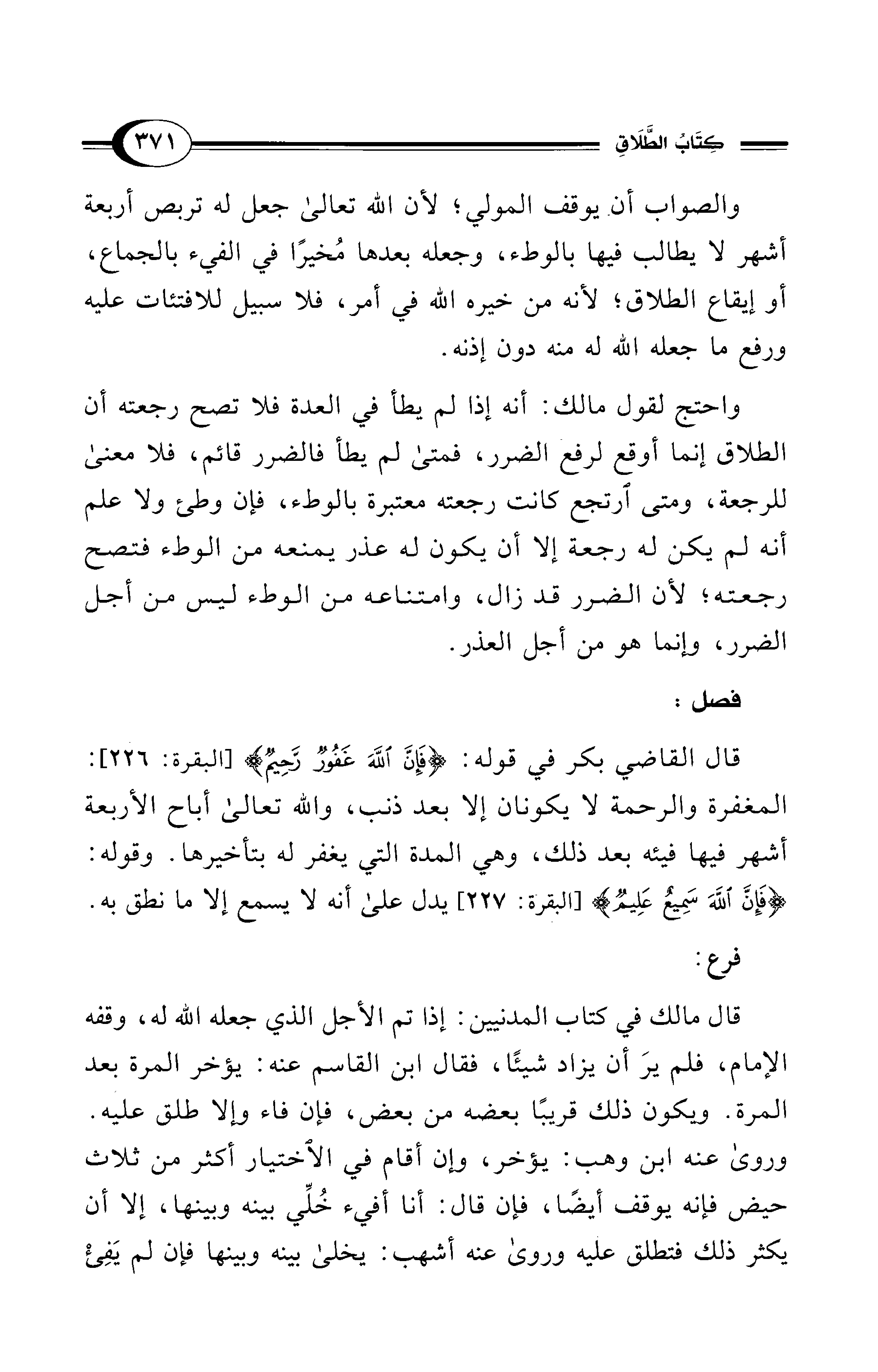 قال القاضي بكر في قوله: {فَإِنَّ اللهَ غَفُورٌ رَحِيمٌ} [البقرة: 226]: المغفرة والرحمة لا يكونان إلا بعد ذنب، والله تعالى أباح الأربعة أشهر فيها فيئه بعد ذلك، وهي المدة التي يغفر له بتأخيرها. وقوله: {فَإِنَّ اللهَ سَمِيعٌ عَلِيمٌ} [البقرة: 227] يدل علي أنه لا يسمع إلا ما نطق به.