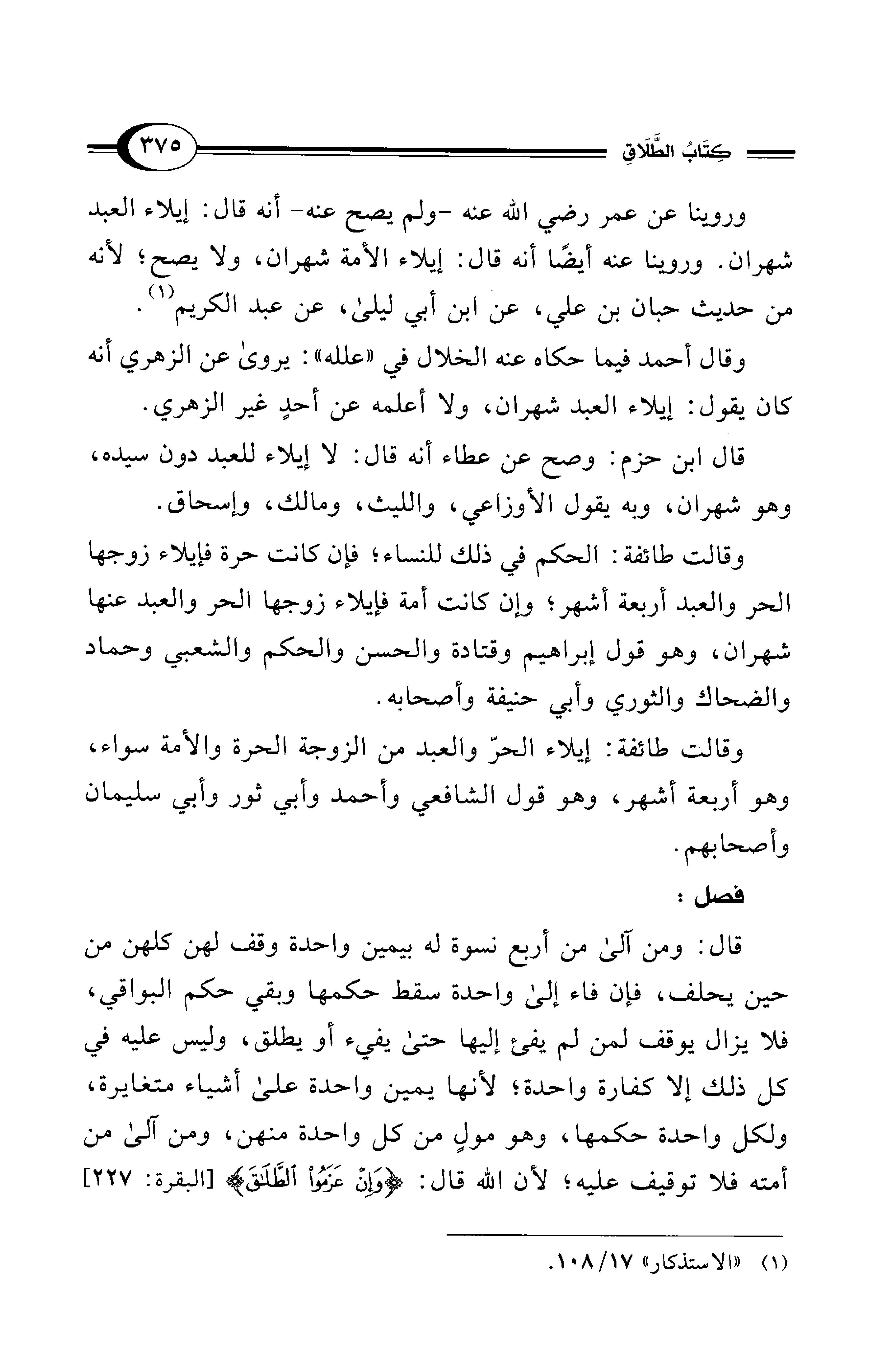وروينا عن عمر - رضي الله عنه -ولم يصح عنه- أنه قال: إيلاء العبد شهران. وروينا عنه أيضًا أنه قال: إيلاء الأمة شهران، ولا يصح؛ لأنه من حديث حبان بن علي، عن ابن أبي ليلى، عن عبد الكريم (¬1).