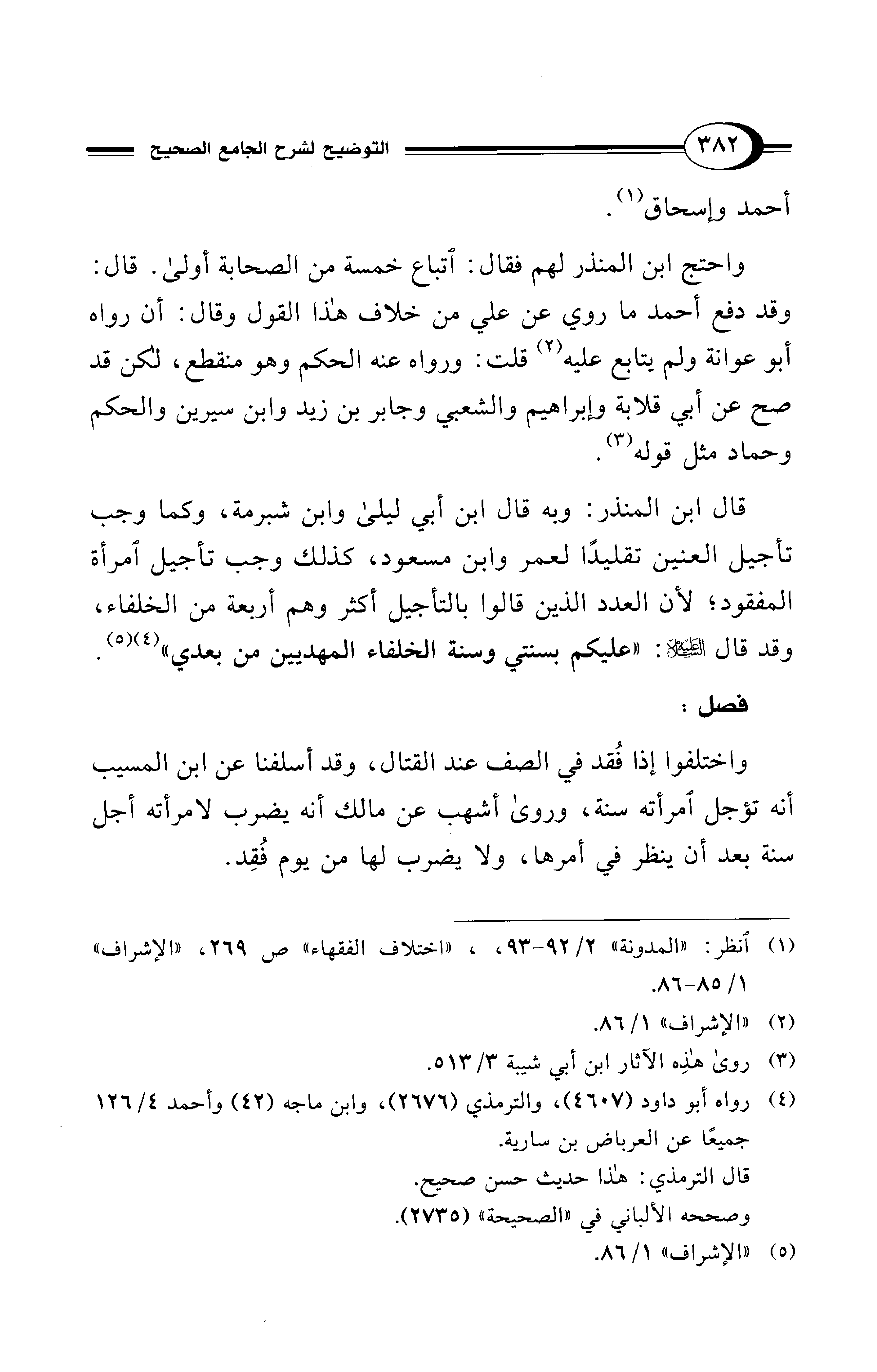 قال ابن المنذر: وبه قال ابن أبي ليلى وابن شبرمة، وكما وجب تأجيل العنين تقليدًا لعمر وابن مسعود، كذلك وجب تأجيل امرأة المفقود؛ لأن العدد الذين قالوا بالتأجيل أكثر وهم أربعة من الخلفاء، وقد قال - عليه السلام -: "عليكم بسنتي وسنة الخلفاء المهديين من بعدي" (¬4) (¬5).