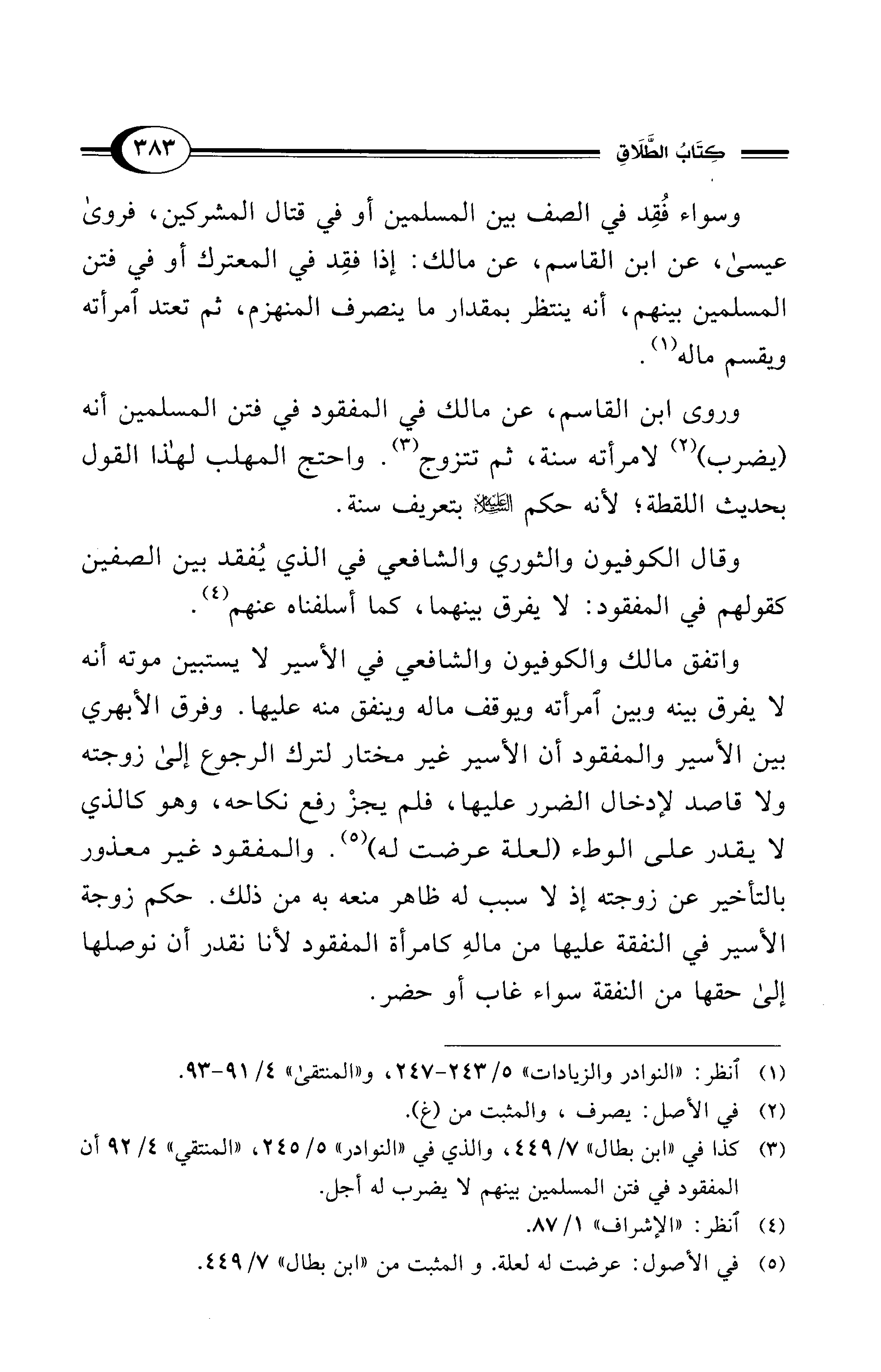 (¬3) كذا في "ابن بطال" 7/ 449، والذي في "النوادر" 5/ 245، "المنتقي" 4/ 92 أن المفقود في فتن المسلمين بينهم لا يضرب له أجل.