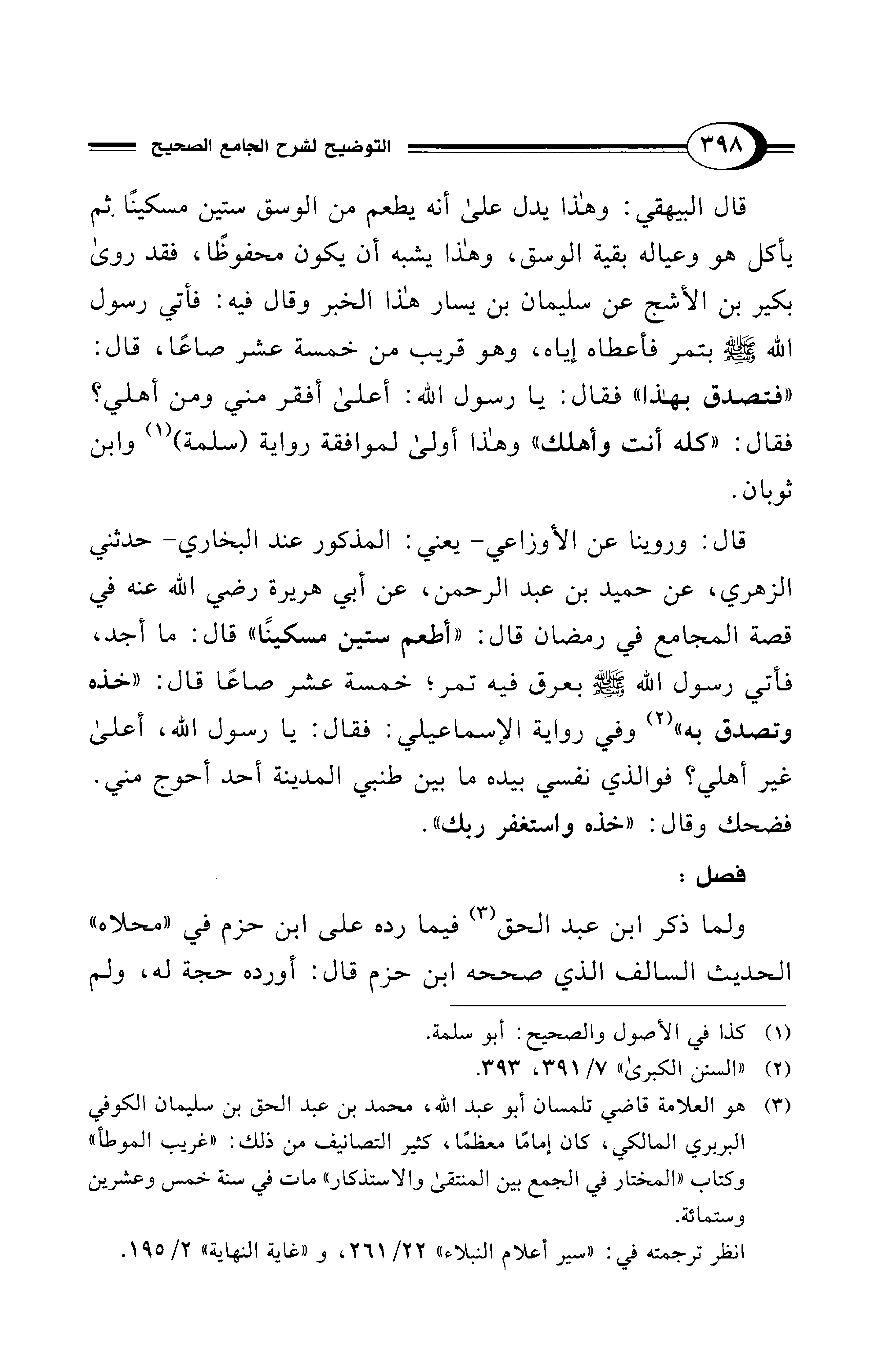 قال البيهقي: وهذا يدل علي أنه يطعم من الوسق ستين مسكينًا. ثم يأكل هو وعياله بقية الوسق، وهذا يشبه أن يكون محفوظًا، فقد روى بكير بن الأشج عن سليمان بن يسار هذا الخبر وقال فيه: فأتي رسول الله - صلى الله عليه وسلم - بتمر فأعطاه إياه، وهو قريب من خمسة عشر صاعًا، قال: "فتصدق بهذا" فقال: يا رسول الله: أعلى أفقر مني ومن أهلي؟ فقال: "كله أنت وأهلك" وهذا أولى لموافقة رواية (سلمة) (¬1) وابن ثوبان.