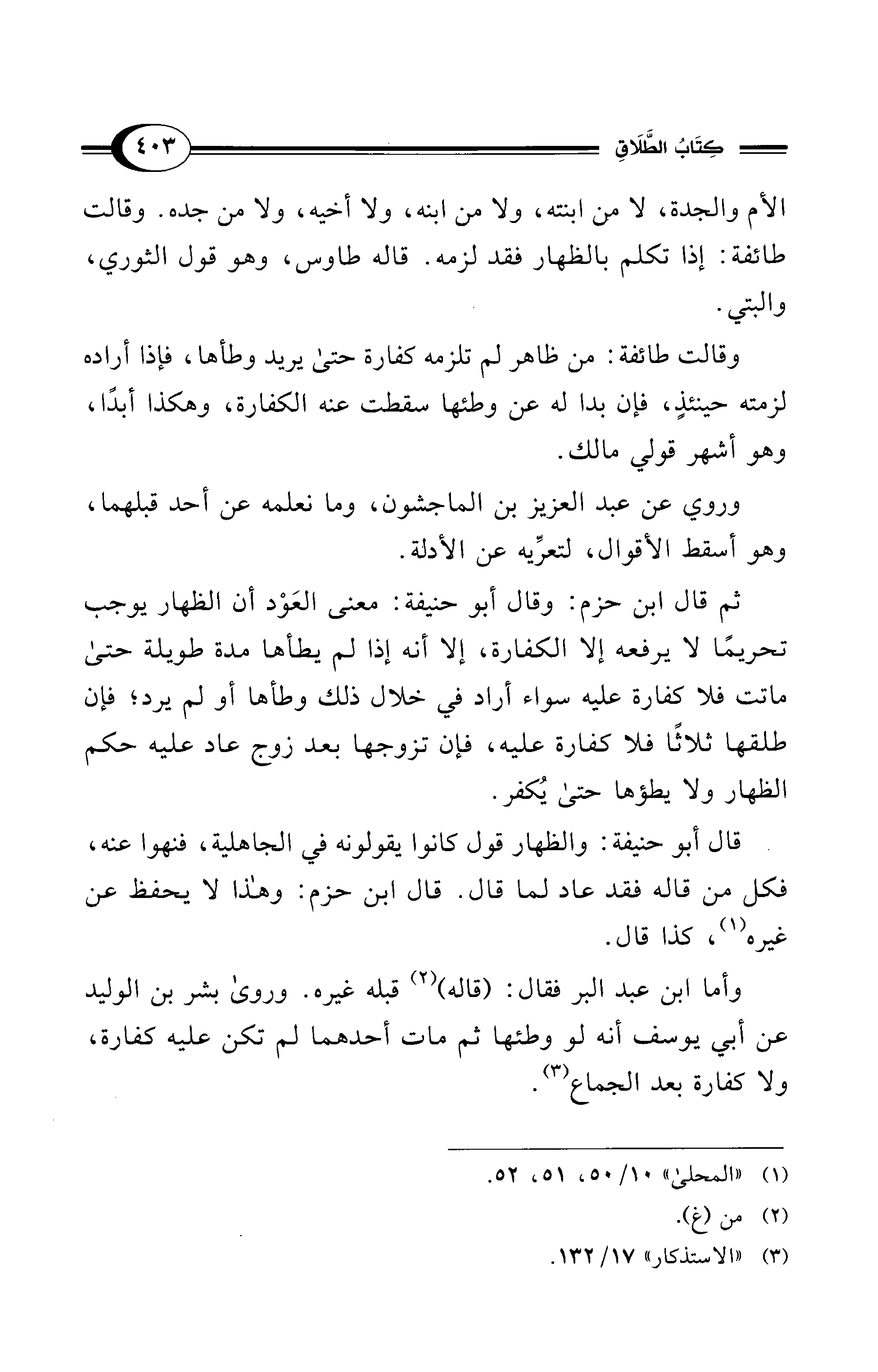 ثم قال ابن حزم: وقال أبو حنيفة: معنى العَوْد أن الظهار يوجب تحريمًا لا يرفعه إلا الكفارة، إلا أنه إذا لم يطأها مدة طويلة حتى ماتت فلا كفارة عليه سواء أراد في خلال ذلك وطأها أو لم يرد؛ فإن طلقها ثلاثًا فلا كفارة عليه، فإن تزوجها بعد زوج عاد عليه حكم الظهار ولا يطؤها حتى يُكفر.