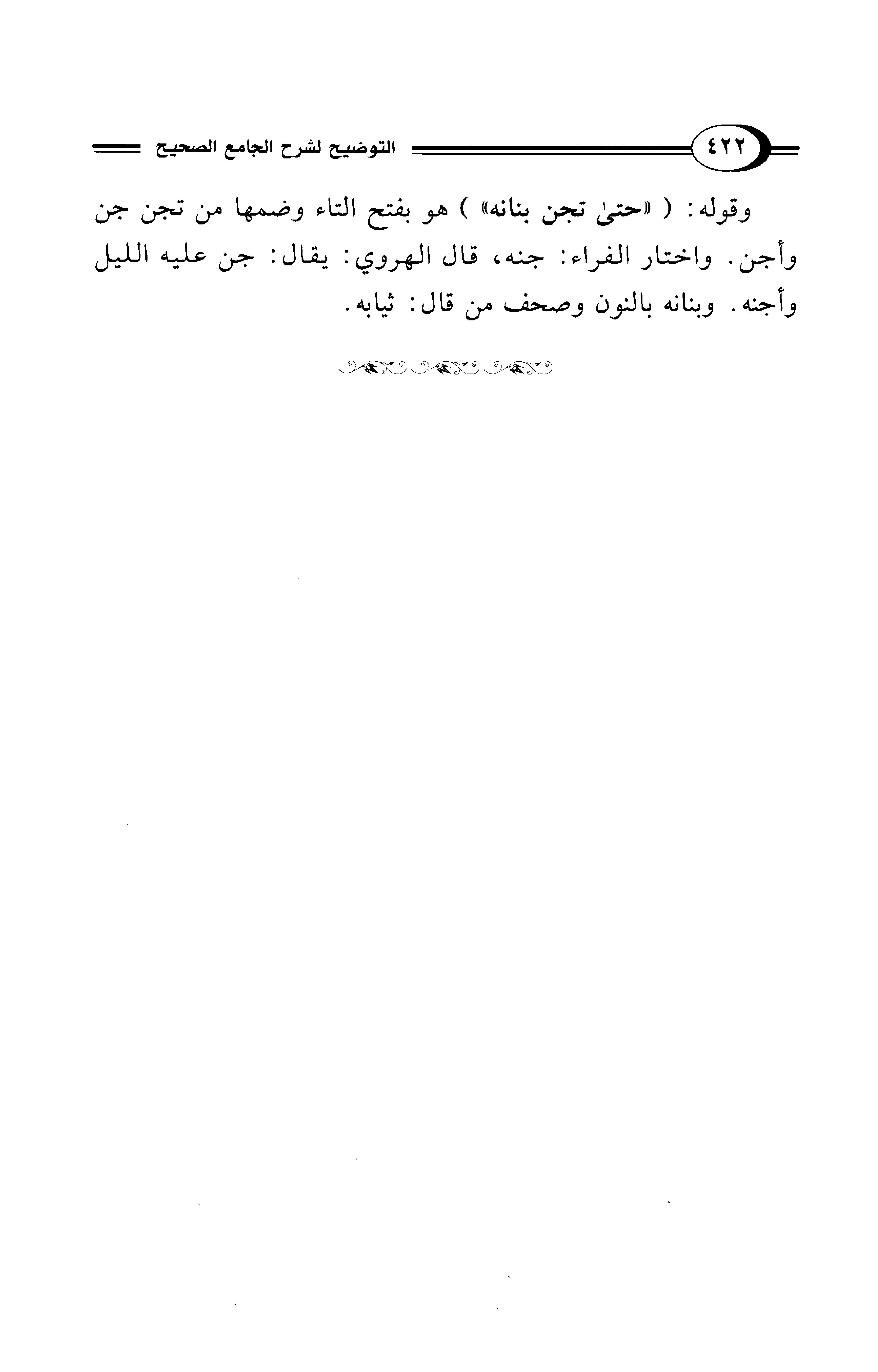 وقوله: ("حتى تجن بنانه") هو بفتح التاء وضمها من تجن جن وأجن. واختار الفراء: جنه، قال الهروي: يقال: جن عليه الليل وأجنه. وبنانه بالنون وصحف من قال: ثيابه.