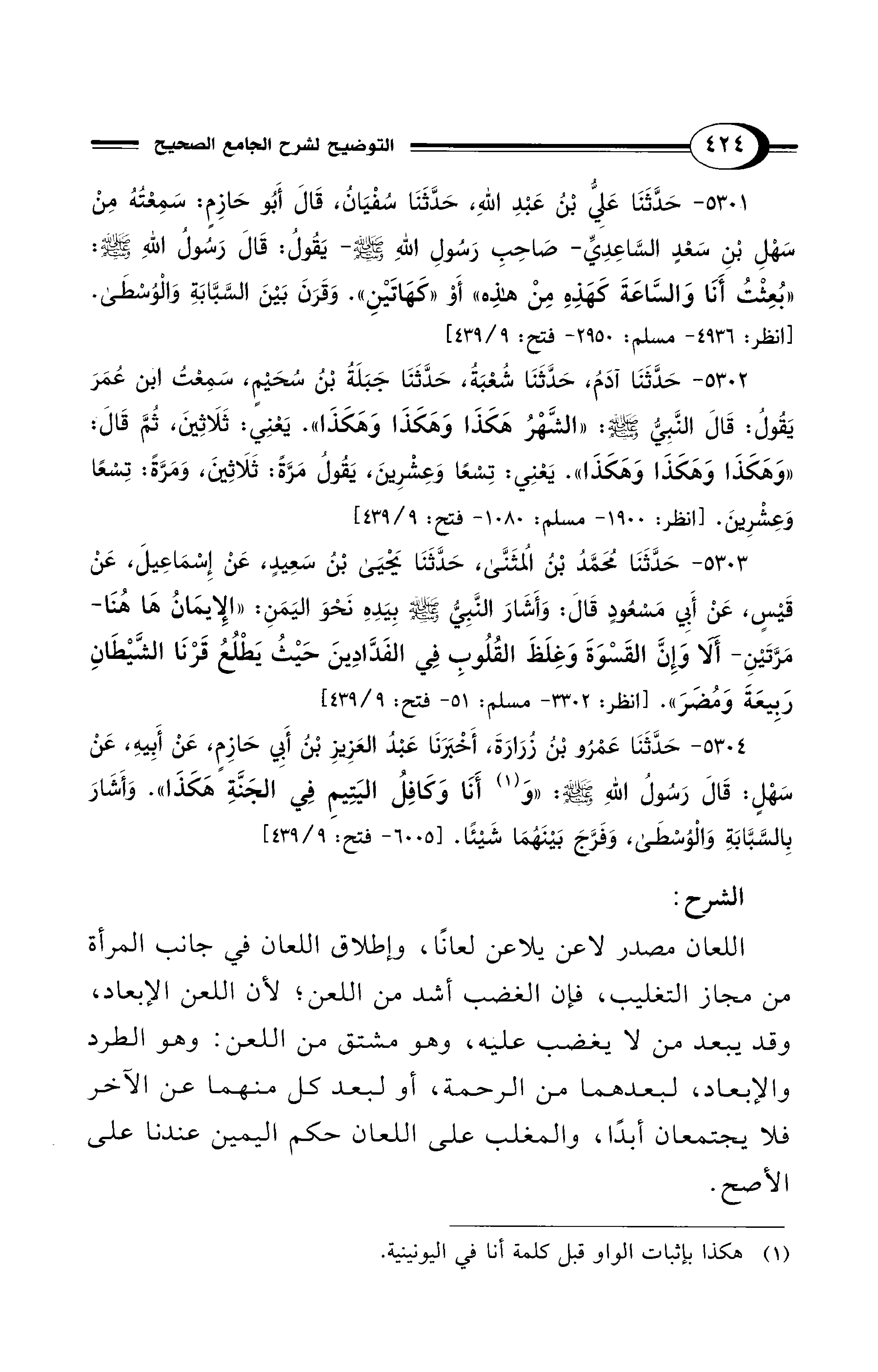 5304 - حَدَّثَنَا عَمْرُو بْنُ زُرَارَةَ, أَخْبَرَنَا عَبْدُ الْعَزِيزِ بْنُ أَبِى حَازِمٍ, عَنْ أَبِيهِ, عَنْ سَهْلٍ: قَالَ رَسُولُ اللهِ - صلى الله عليه وسلم -: «و (¬1) أَنَا وَكَافِلُ الْيَتِيمِ فِي الْجَنَّةِ هَكَذَا». وَأَشَارَ بِالسَّبَّابَةِ وَالْوُسْطَى، وَفَرَّجَ بَيْنَهُمَا شَيْئًا. [6005 - فتح 9/ 439].